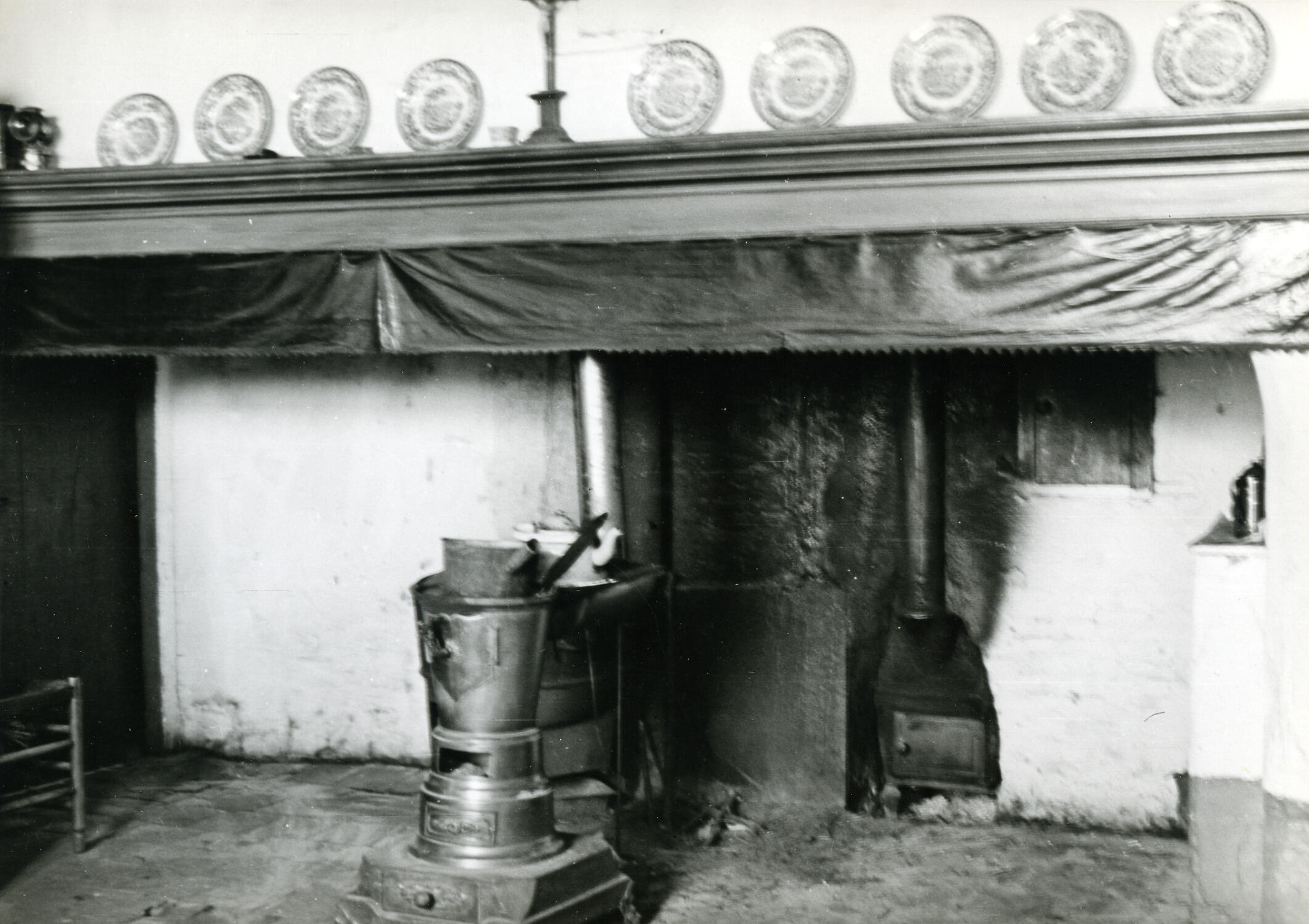 Schoorsteenmantel in de woonkeuken van een boerderij in Berghem, bij Oss. Op de rand van de schouw staan wandborden. Onderlangs de rand hangt een schoorsteenval.