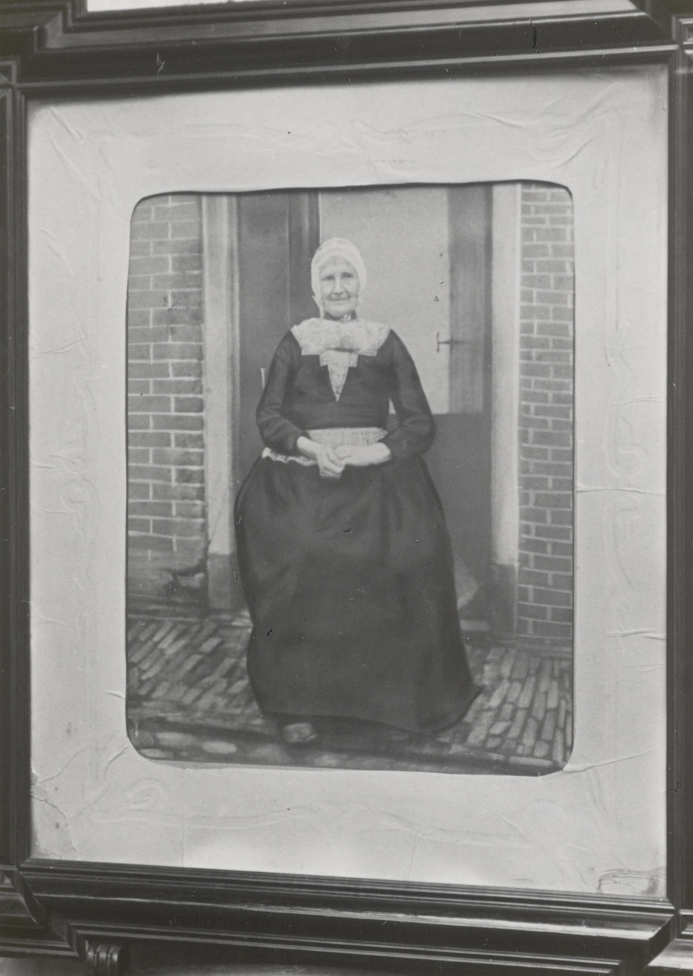 Ingelijste foto van Maria de Boer-Kianus (1826-1912), gekleed in de streekdracht van Schokland. Ze draagt zondagse dracht. De foto is eigendom van familie De Boer in Vollenhove.