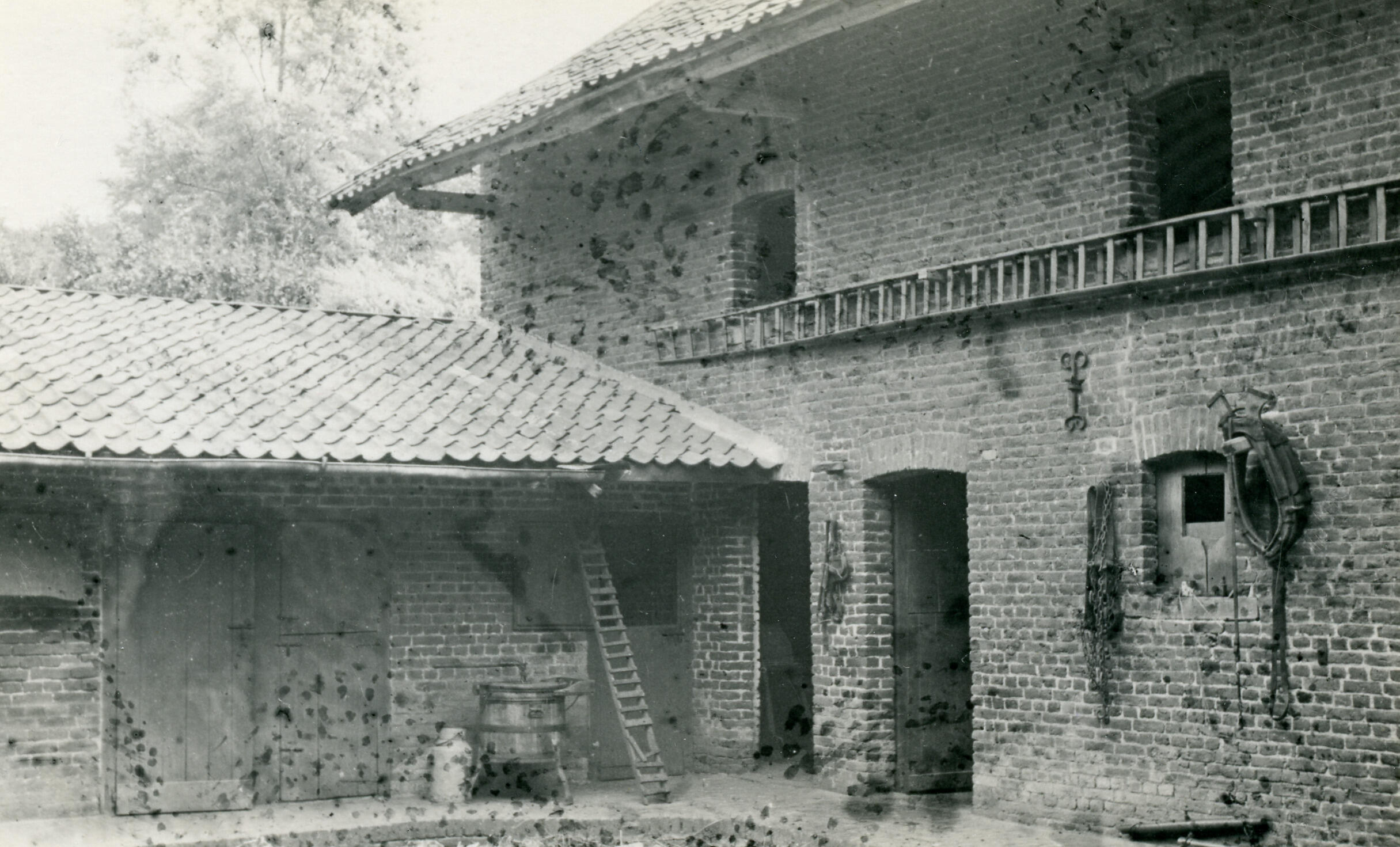 De binnenplaats van een boerderij in Welten, een dorp bij Heerlen. Aan de muur hangen lange ladders.