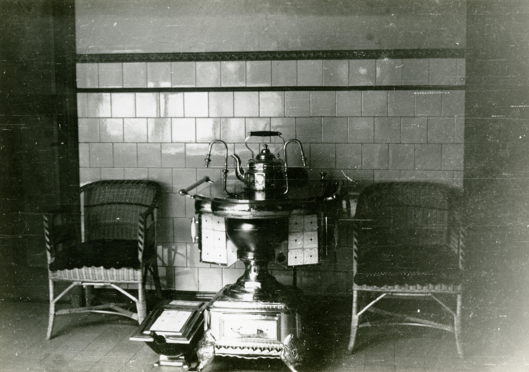 Een kachel in het interieur van een woning in Amby, bij Maastricht. Aan weerszijden van de kachel staat een stoel. Links van de kachel staat een kolenbak.