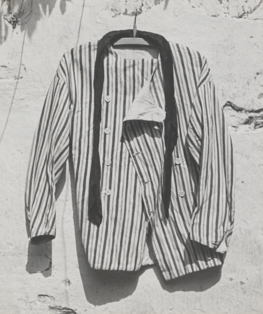 Zogenoemd baadje, een mannenjak van gestreepte stof, met een halsdoek. Het baadje met halsdoek is afkomstig van het voormalige eiland Schokland en eigendom van een familie in Vollenhove.