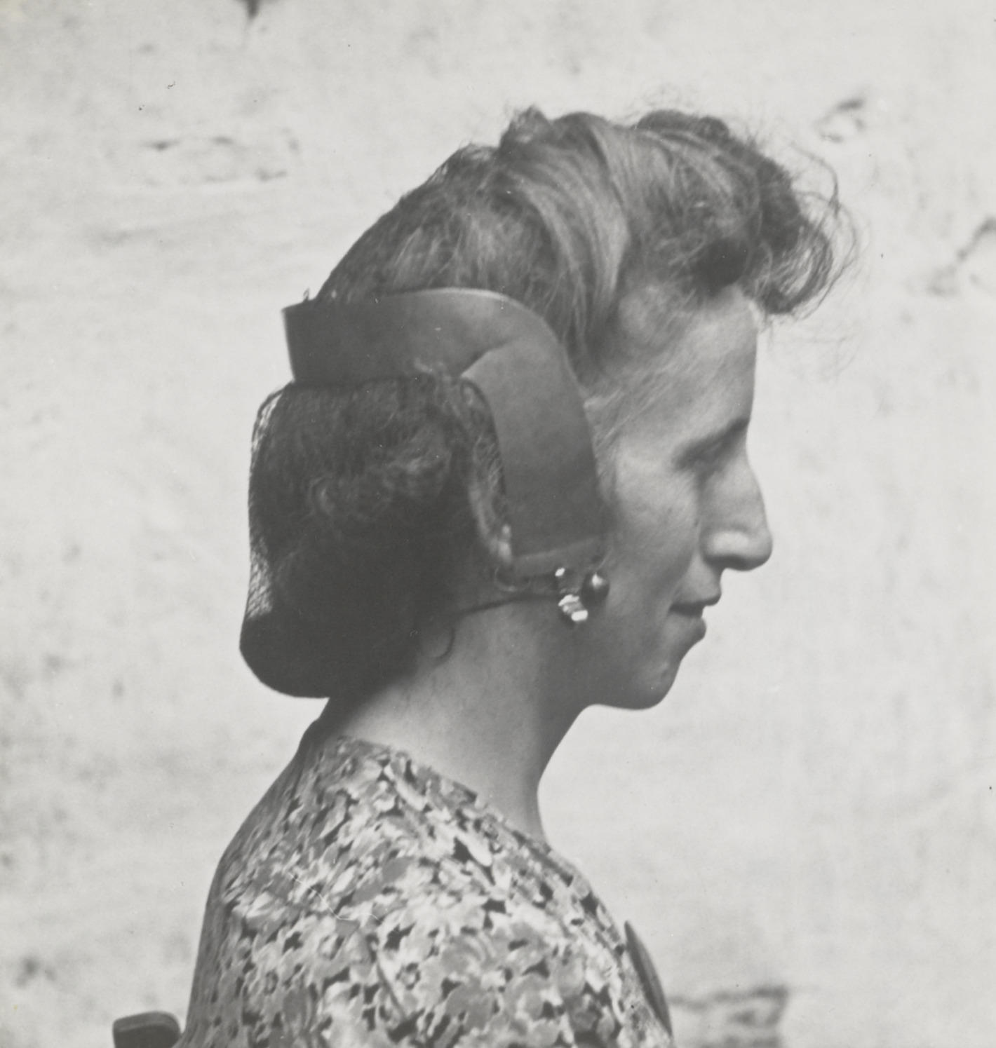Vrouw met oorijzer van Schokland, 1947 (zwart-wit foto)