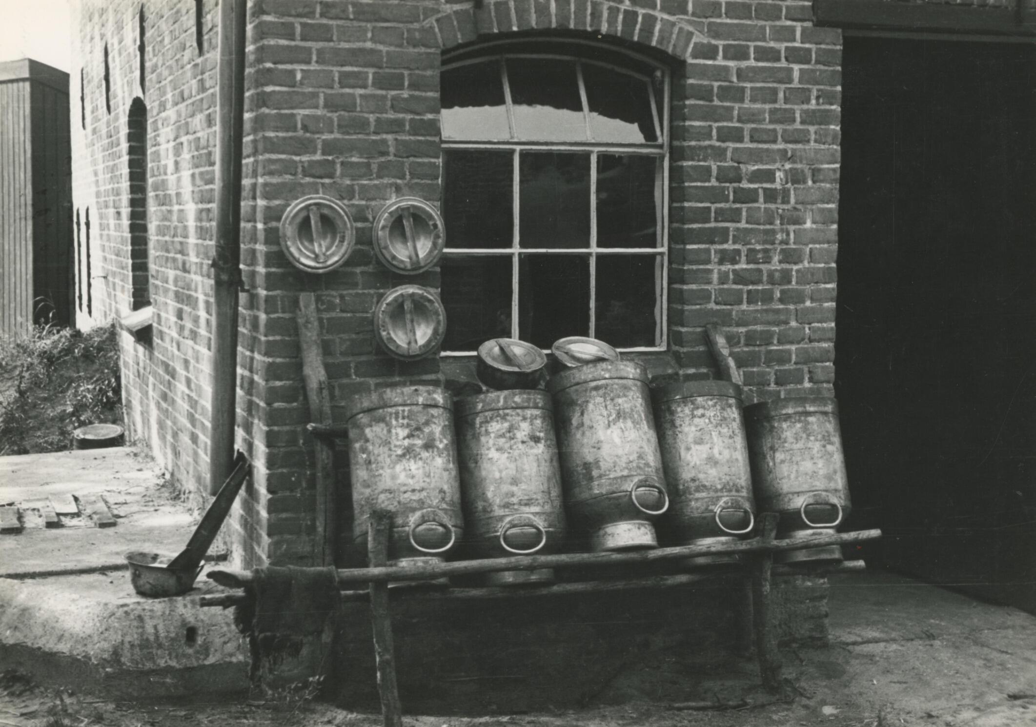 Een melkbussenrek met vijf melkbussen tegen de muur van een boerderij in Veghel.