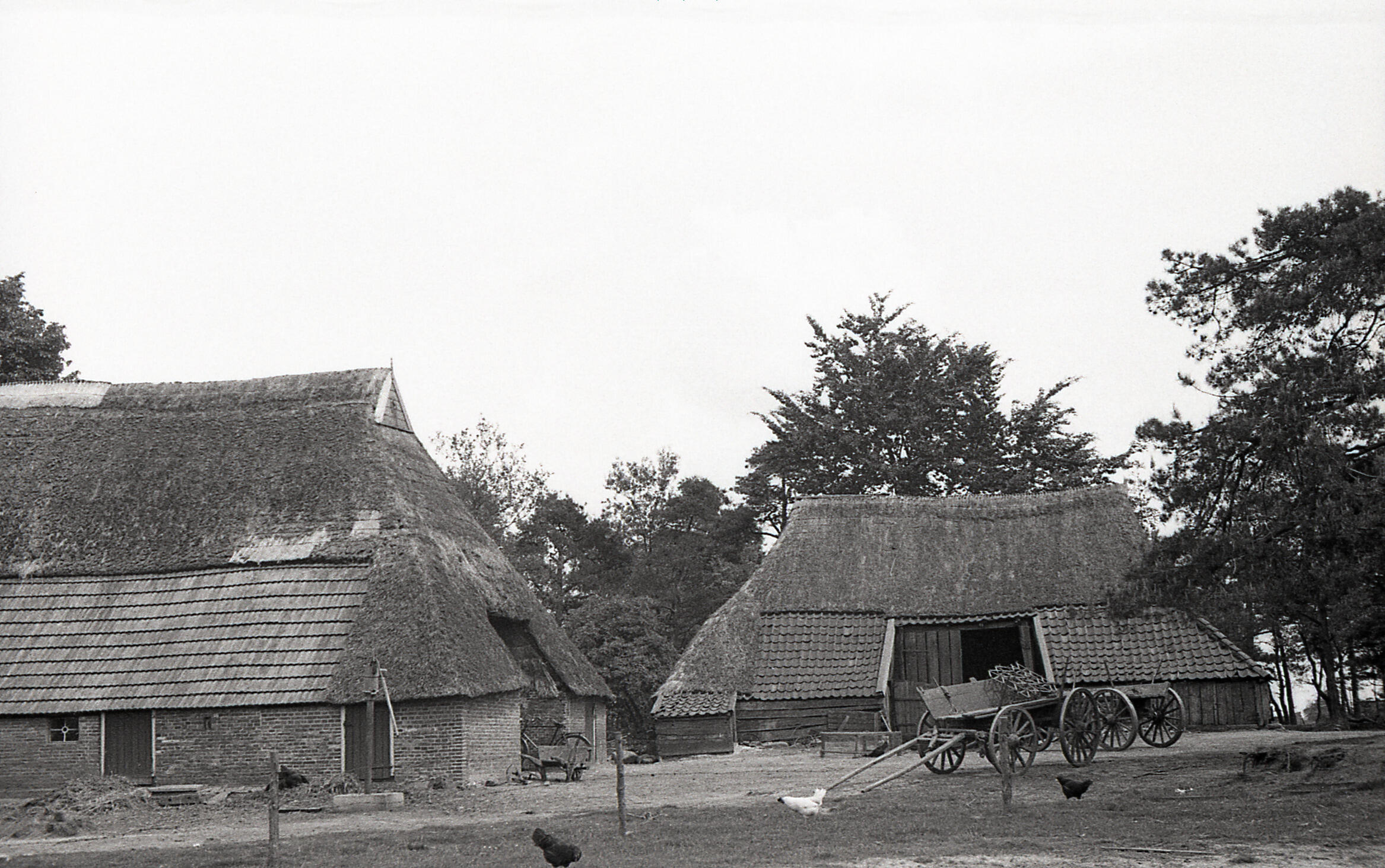 Een boerderij met een schuur in de gemeente Hellendoorn. Op het erf staan twee boerenwagens.