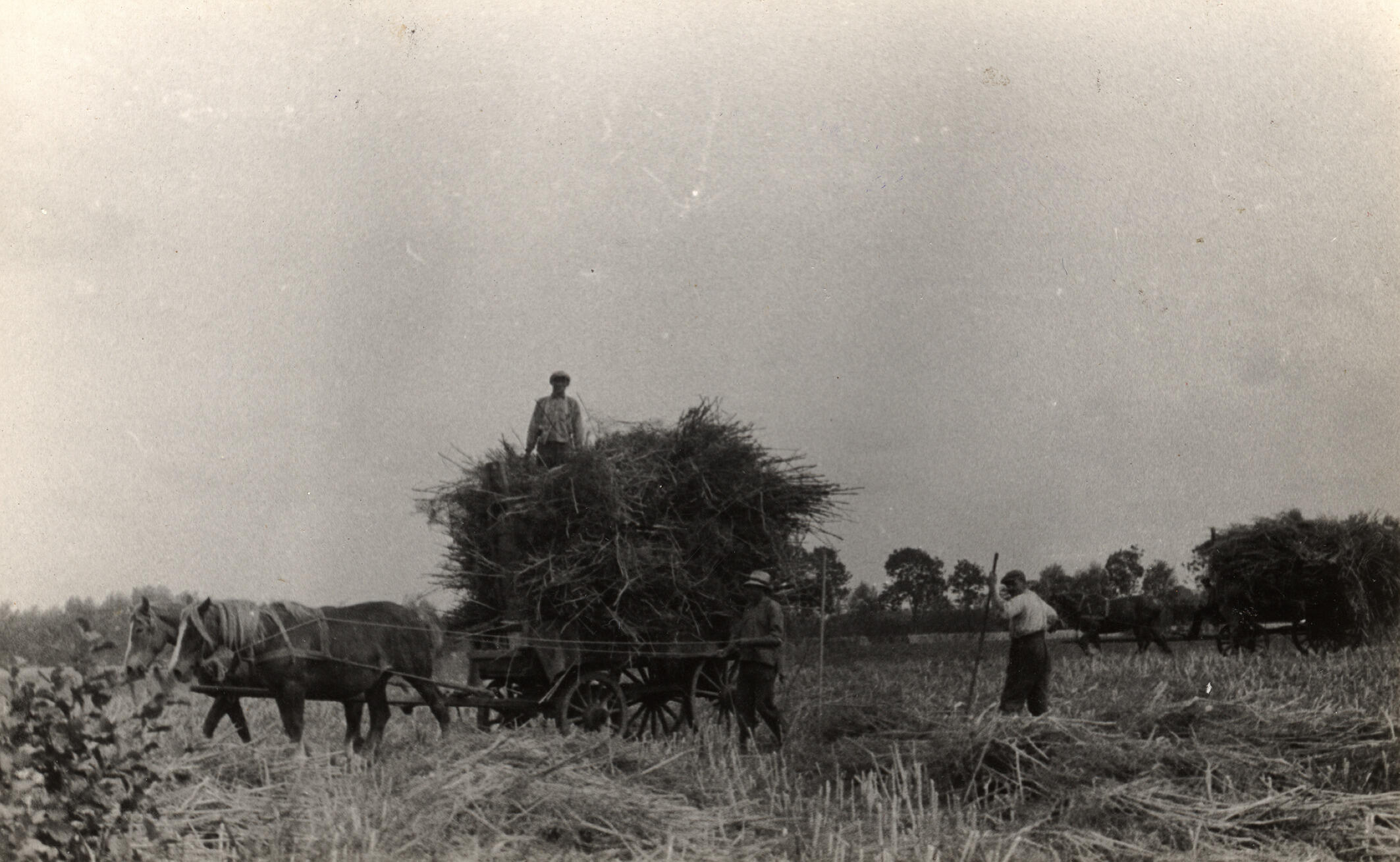 Het vervoer van mosterdzaad op een akker in Uithuizen. Voor de opgetaste boerenwagen zijn twee paarden ingespannen.