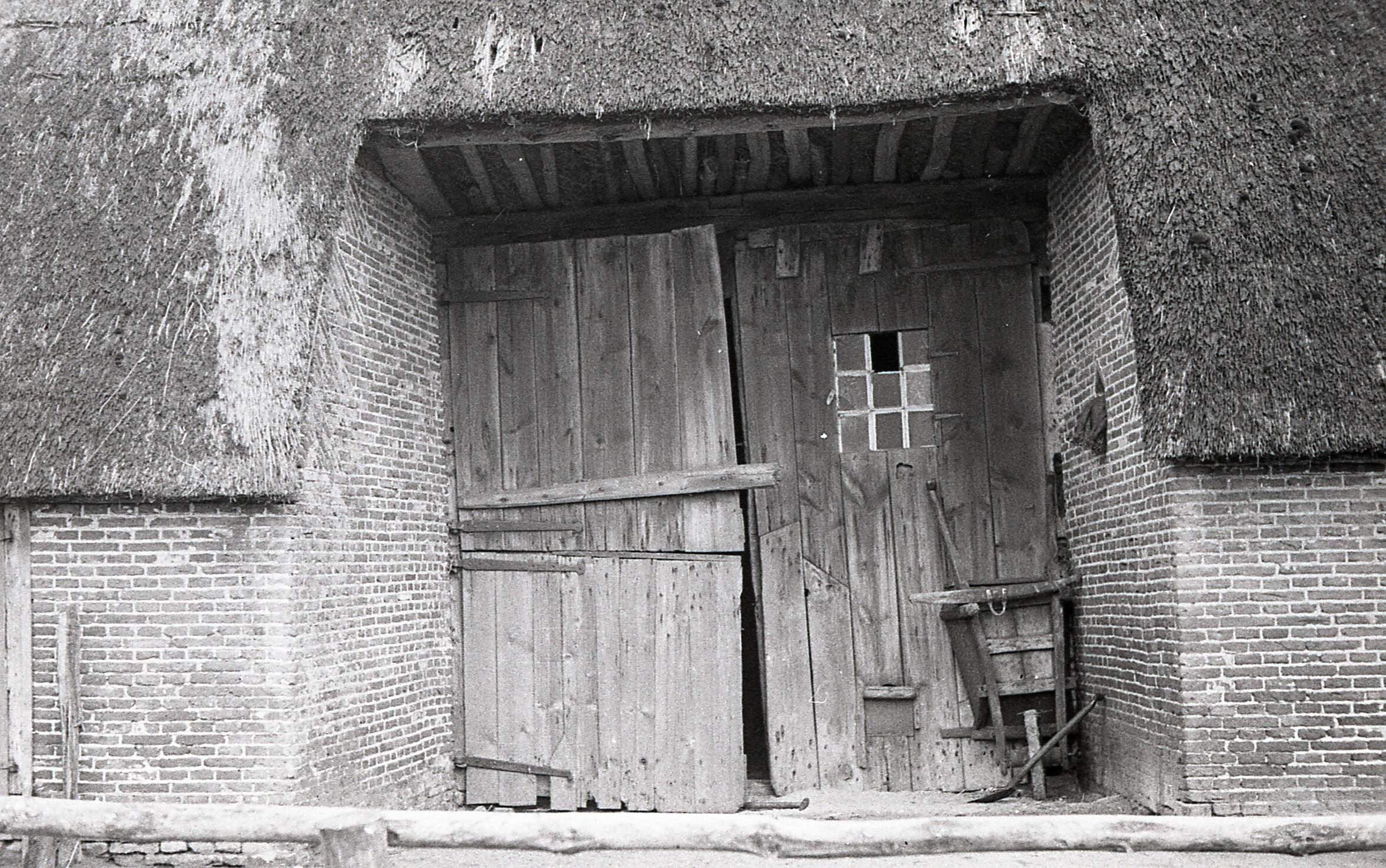 Inrijdeuren in de achtergevel van een boerderij, in de provincie Overijssel. Tegen de rechter deur staat een houten kruiwagen.