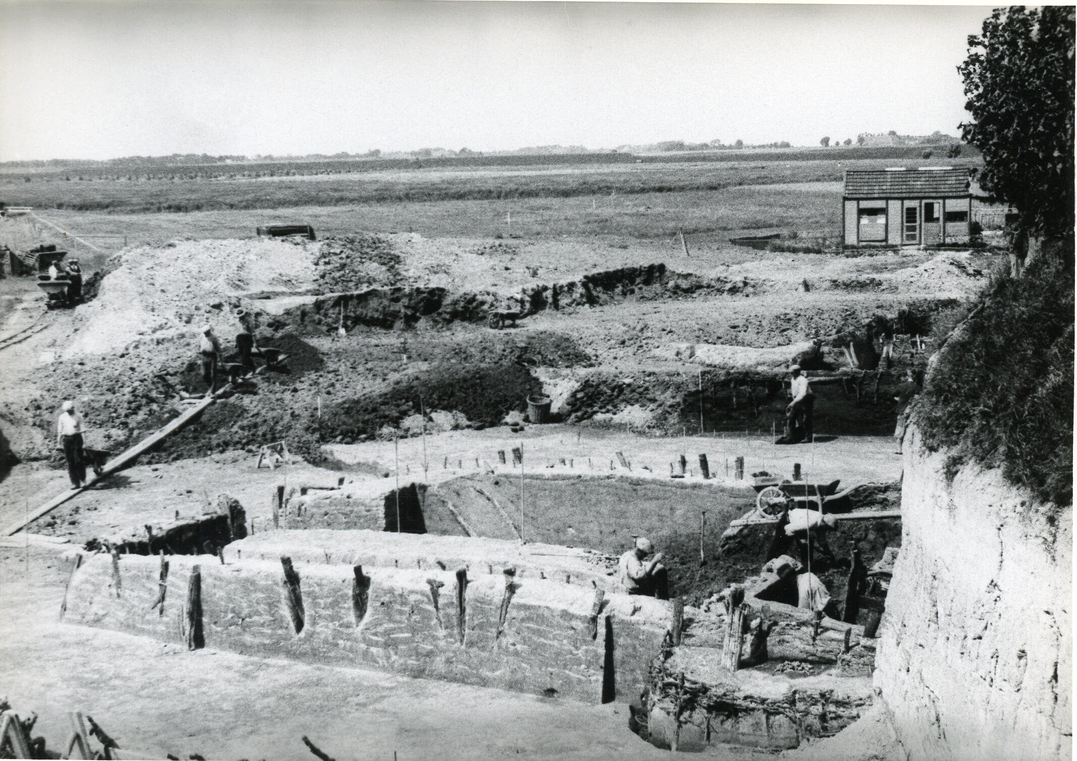 De resten van gebouwen die gevonden zijn tijdens de afgraving van de terp waarop het dorp Ezinge ligt. In Groningen worden terpen wierden genoemd. Afgegraven wierdegrond werd verkocht om te gebruiken als bodemverbeteraar op arme zandgronden. Archeoloog Albert Egges van Giffen (1884-1973) van de Rijksuniversiteit Groningen heeft van 1923 tot 1934 archeologisch onderzoek uitgevoerd bij ...