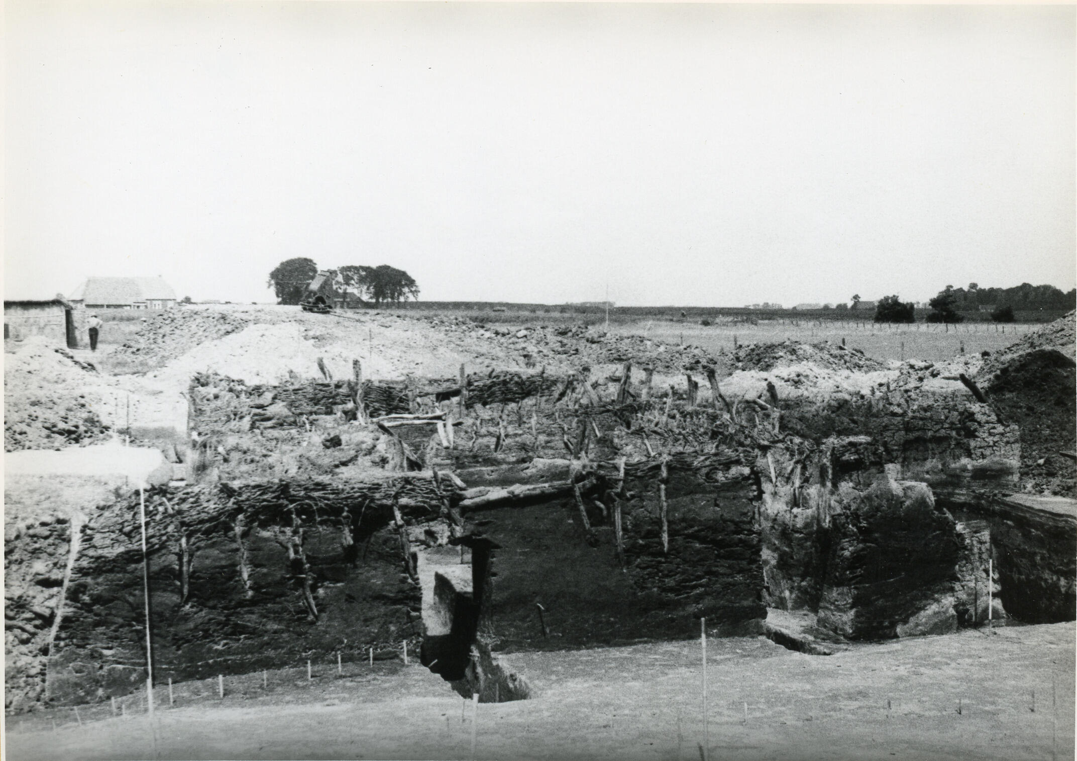 De resten van gebouwen die gevonden zijn tijdens de afgraving van de terp waarop het dorp Ezinge ligt. In Groningen worden terpen wierden genoemd. Afgegraven wierdegrond werd verkocht om te gebruiken als bodemverbeteraar op arme zandgronden. Archeoloog Albert Egges van Giffen (1884-1973) van de Rijksuniversiteit Groningen heeft van 1923 tot 1934 archeologisch onderzoek uitgevoerd bij ...