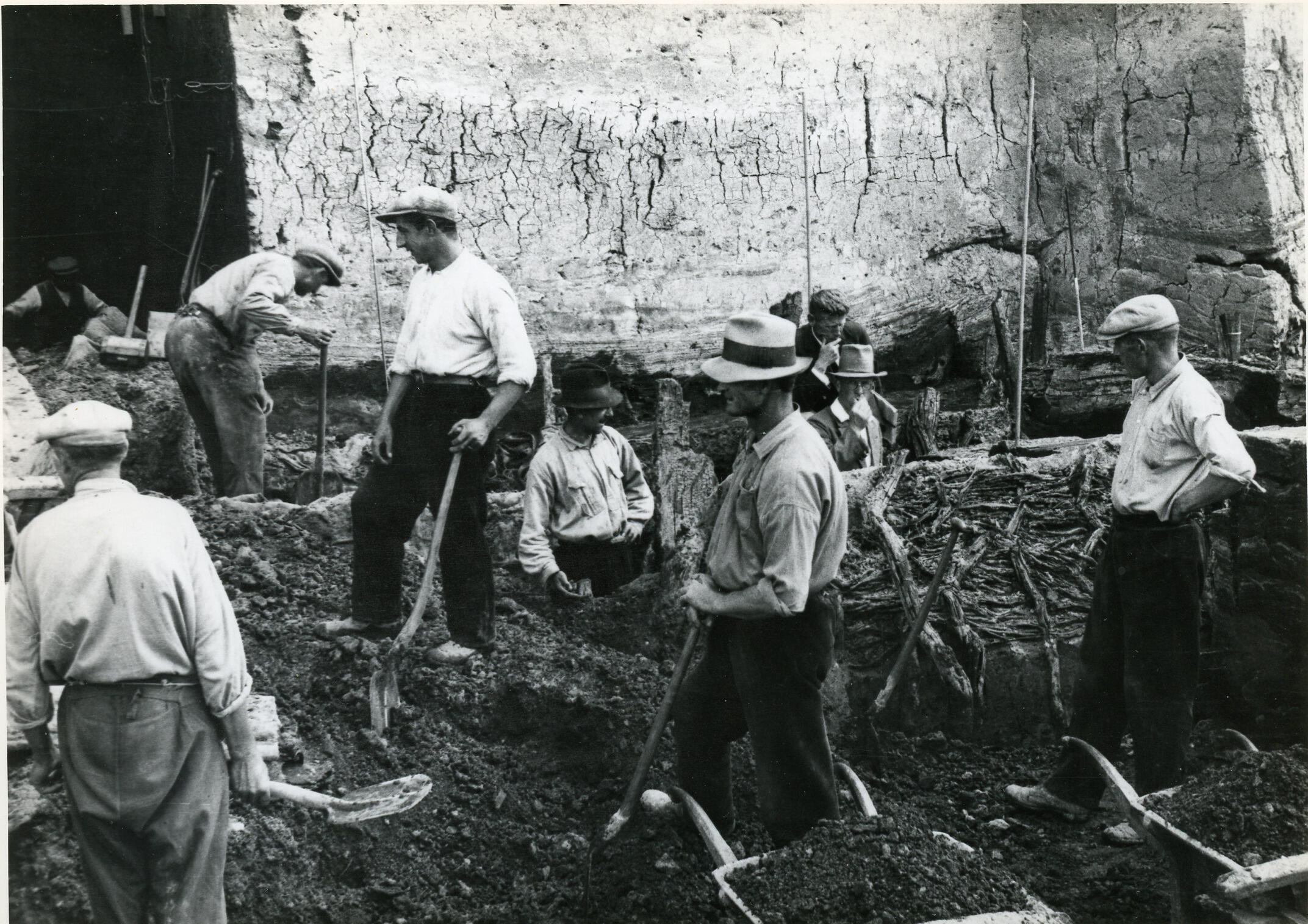 De afgraving van de terp waarop het dorp Ezinge ligt. In Groningen worden terpen wierden genoemd. Afgegraven wierdegrond werd verkocht om te gebruiken als bodemverbeteraar op arme zandgronden. Archeoloog Albert Egges van Giffen (1884-1973) van de Rijksuniversiteit Groningen heeft van 1923 tot 1934 archeologisch onderzoek uitgevoerd bij de afgraving van de wierde van Ezinge. Hij ...