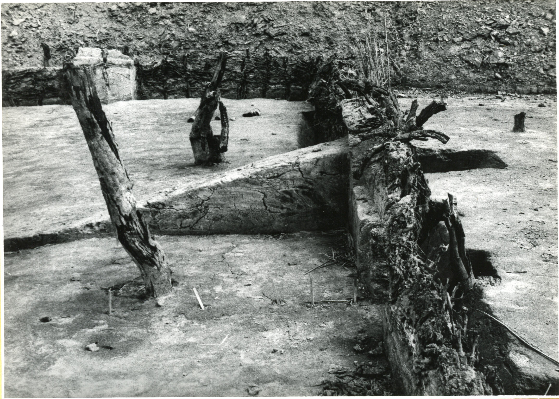 De resten van gebouwen die gevonden zijn tijdens de afgraving van de terp waarop het dorp Ezinge ligt. In Groningen worden terpen wierden genoemd. Afgegraven wierdegrond werd verkocht om te gebruiken als bodemverbeteraar op arme zandgronden. Archeoloog Albert Egges van Giffen (1884-1973) van de Rijksuniversiteit Groningen heeft van 1923 tot 1934 archeologisch onderzoek uitgevoerd bij ...