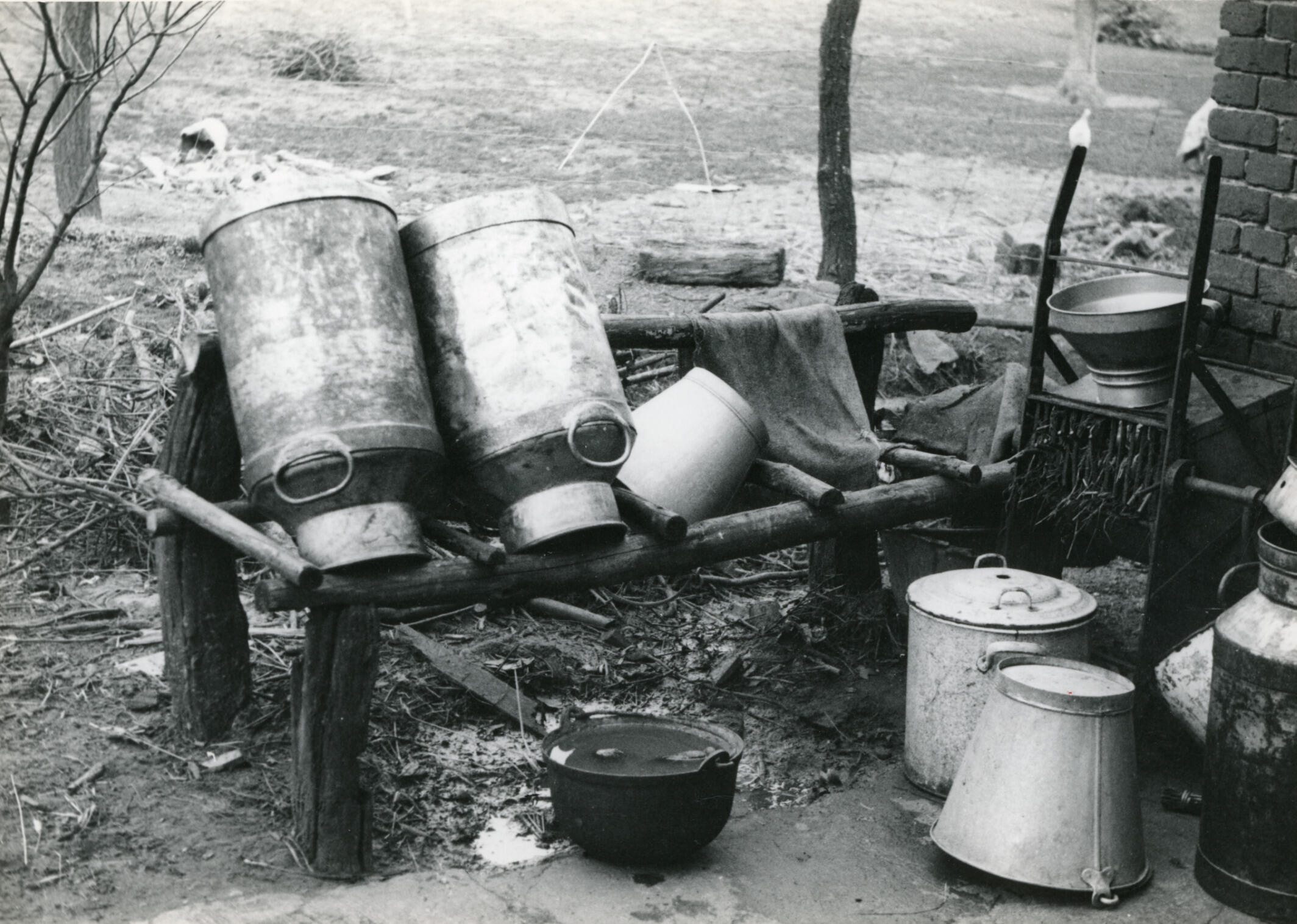 Melkbussenrek, Beers, 1936 (zwart-wit foto)