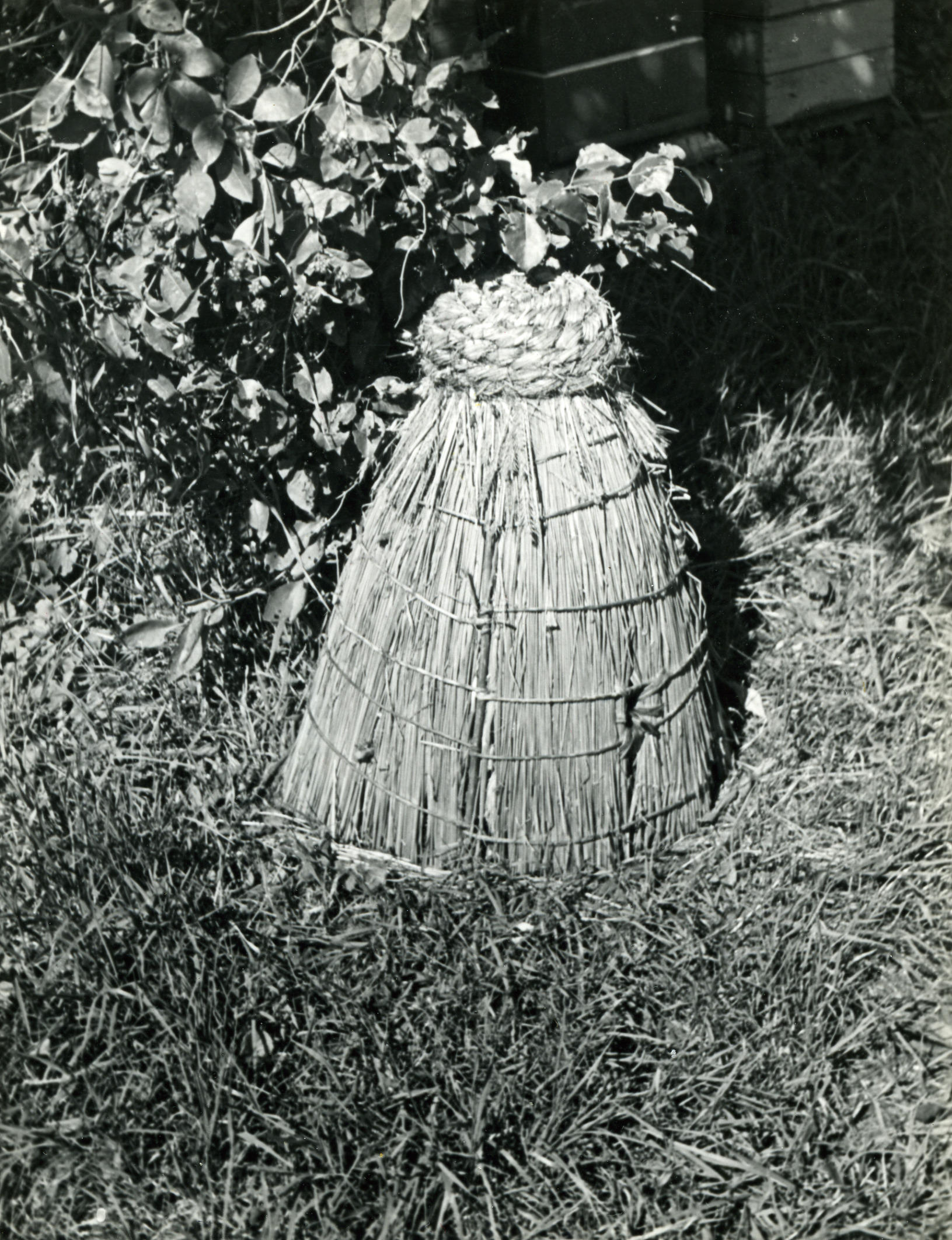 Bijenkorf in Vriezenveen. De bijenkorf is gemaakt van stro, met een bekroning van strovlechtwerk.