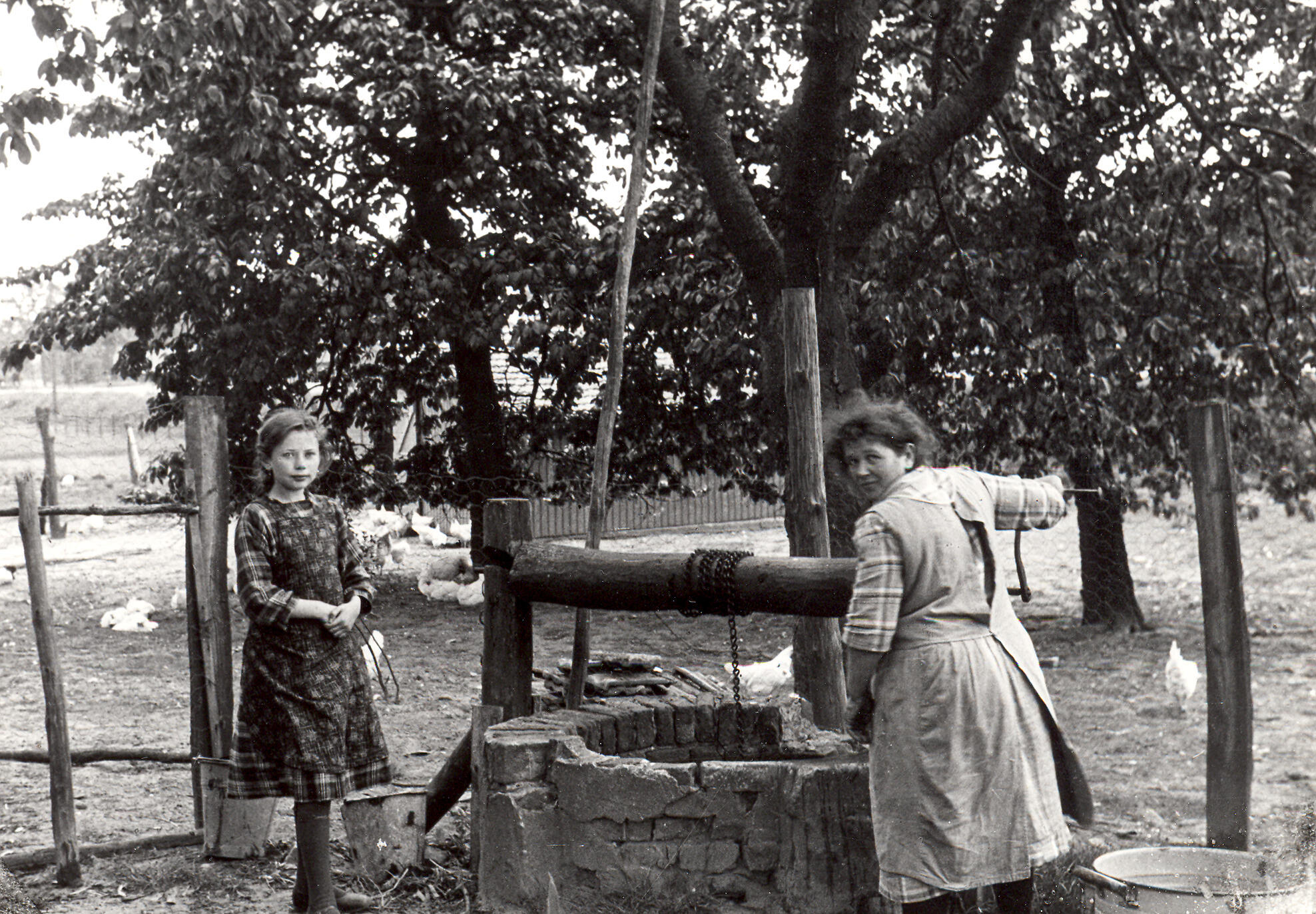 Een meisje en een vrouw naast een waterput bij een boerderij in Heukelum.