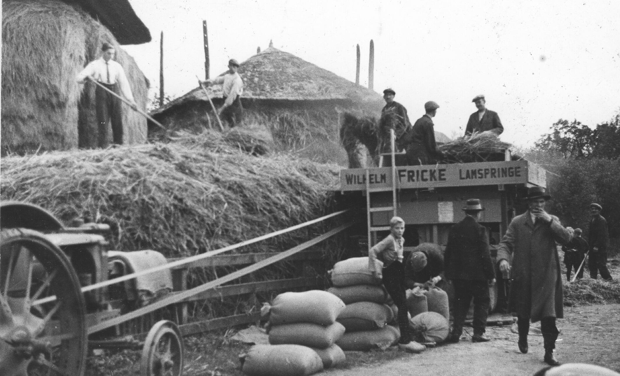 Het dorsen van graan in het Gelderse Delwijnen. De dorsmachine is van het merk Wilhelm Fricke uit Lamspringe en wordt aangedreven door een draaiende band die is verbonden met een tractor. In de bovenkant van de machine worden de halmen met de aren gestopt. Dan worden de graankorrels eruit geschud en opgevangen in juten zakken. ...