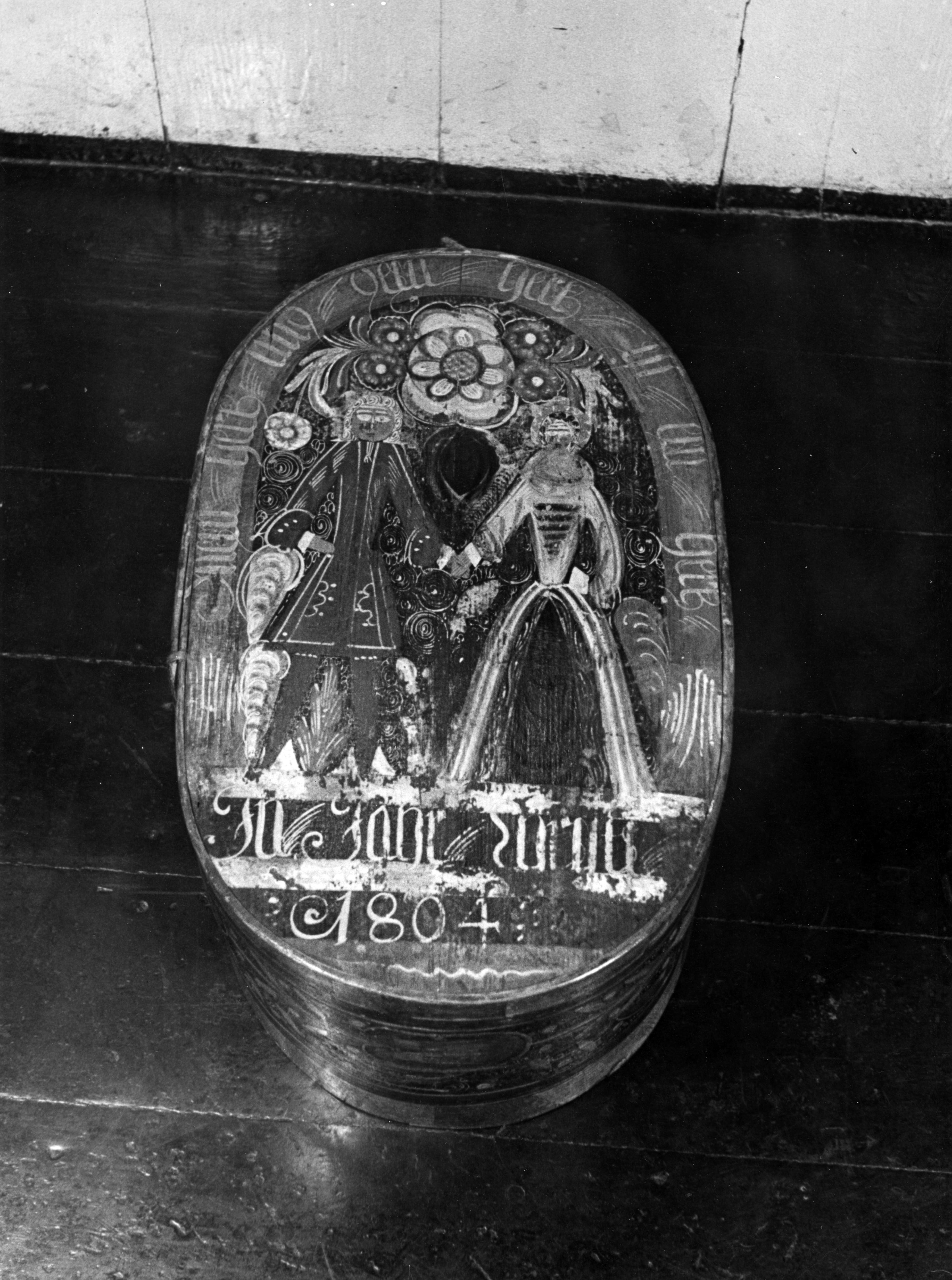 Beschilderde spanen doos met een Duitse tekst en het jaartal 1804, gefotografeerd op Marken.