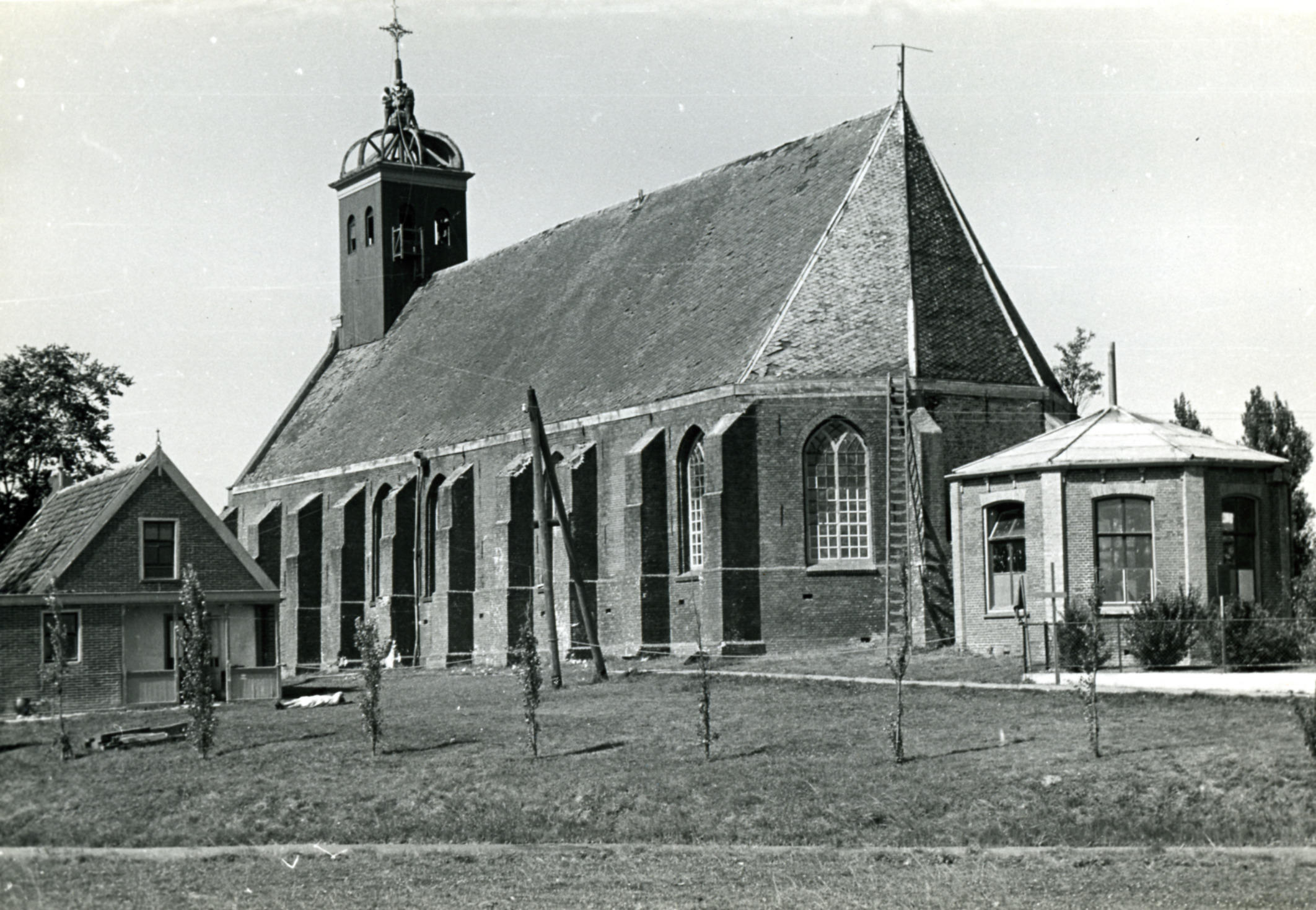 Exterieur van de zestiende-eeuwse hervormde kerk in Koedijk. De foto is genomen tijdens de voorbereidingen van de sloop van de kerk in 1947.