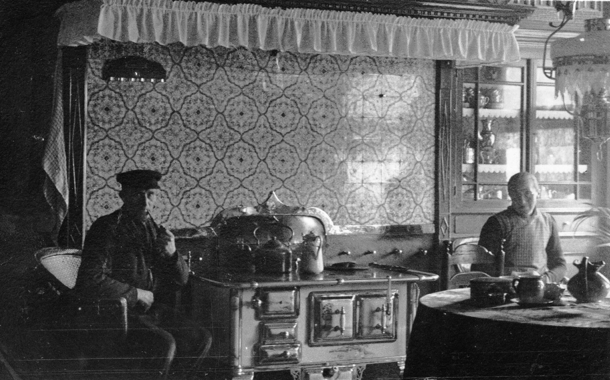 Keukeninterieur met een man en vrouw, IJzerlo, 1938 (zwart-wit foto)