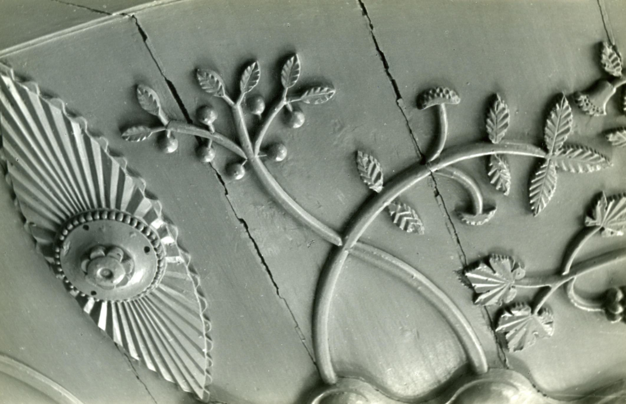 Bewerkt plafond, Assendelft, 1947 (zwart-wit foto)