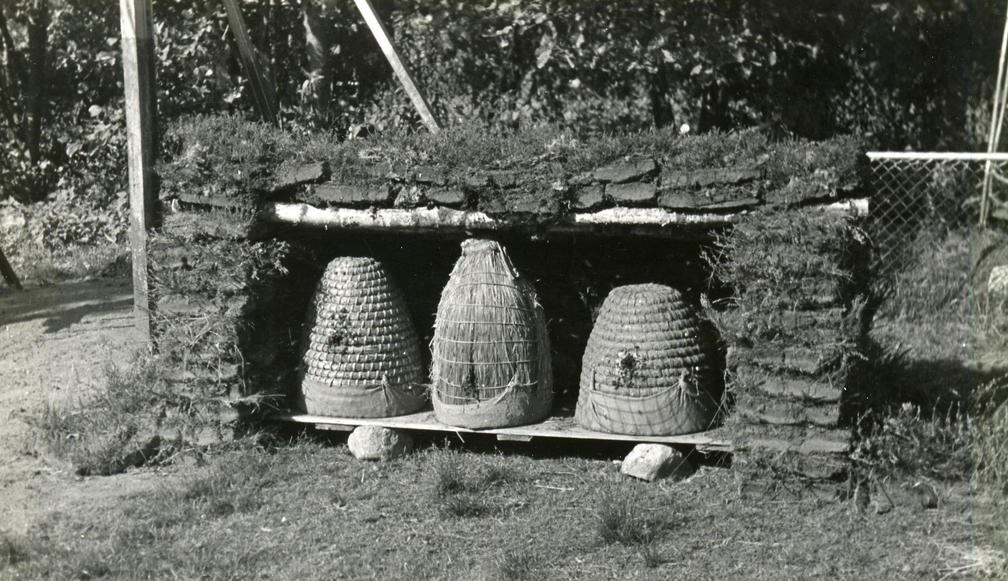 Reconstructie Drentse bijenstand, Assen, 1947 (zwart-wit foto)