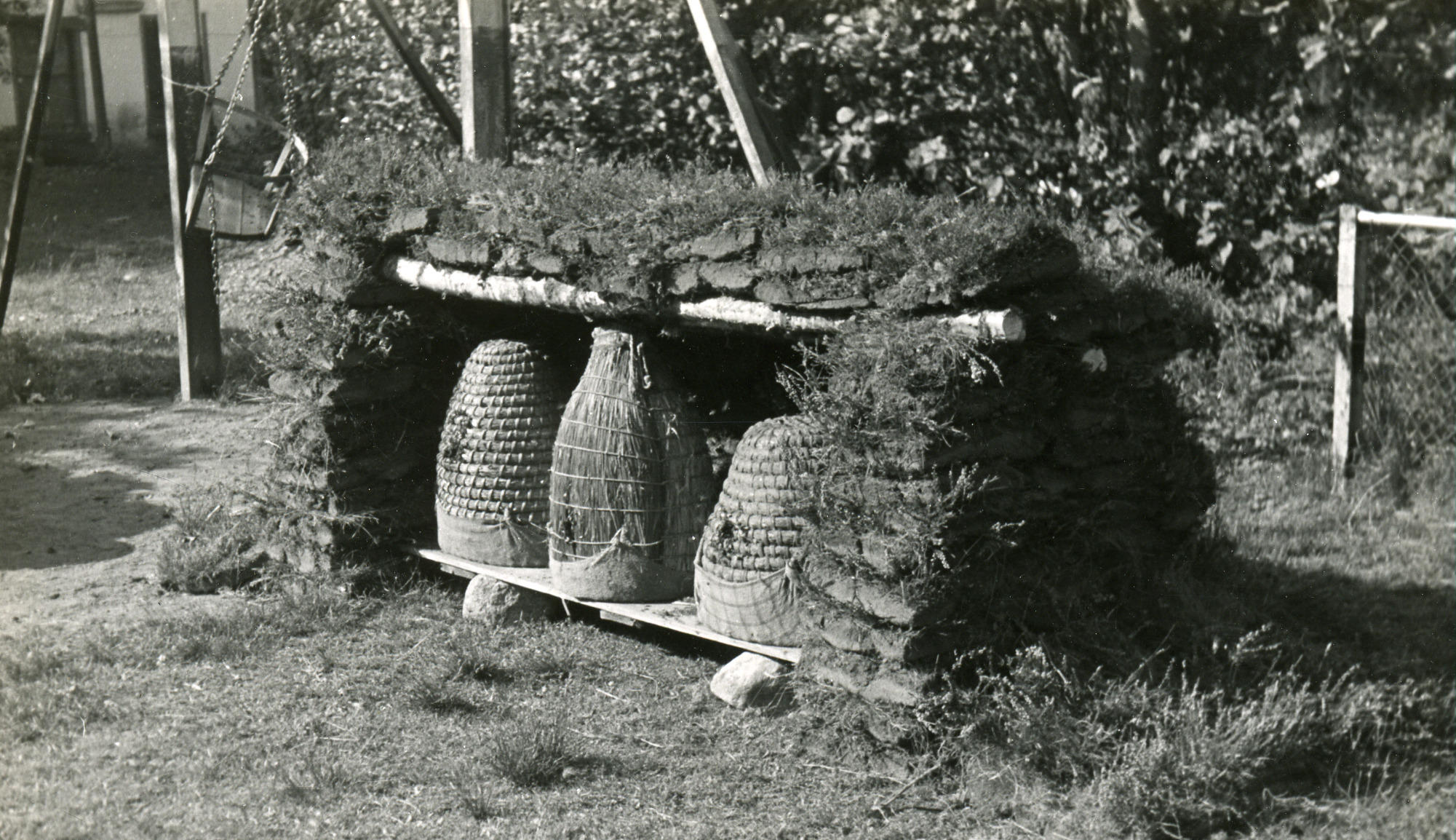 Reconstructie Drentse bijenstand, Assen, 1947 (zwart-wit foto)