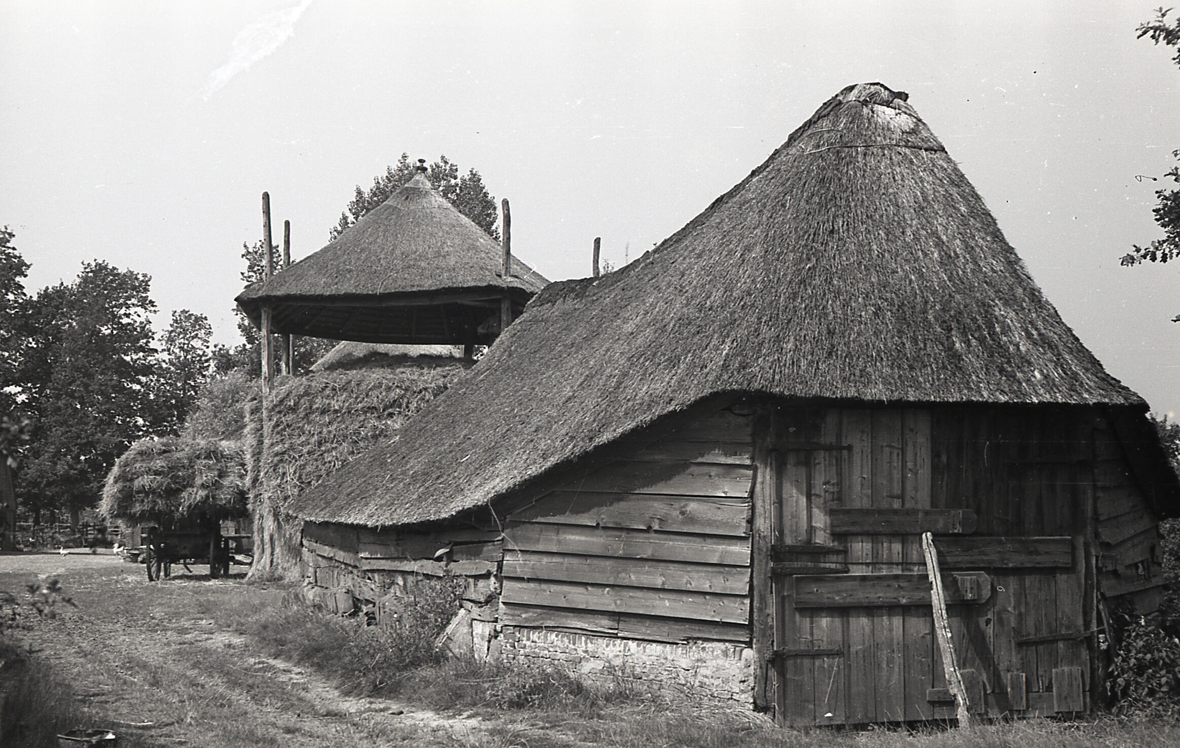 Een schaapskooi in het Gelderse Hoekelum, met daarachter een hooiwagen en een hooiberg.