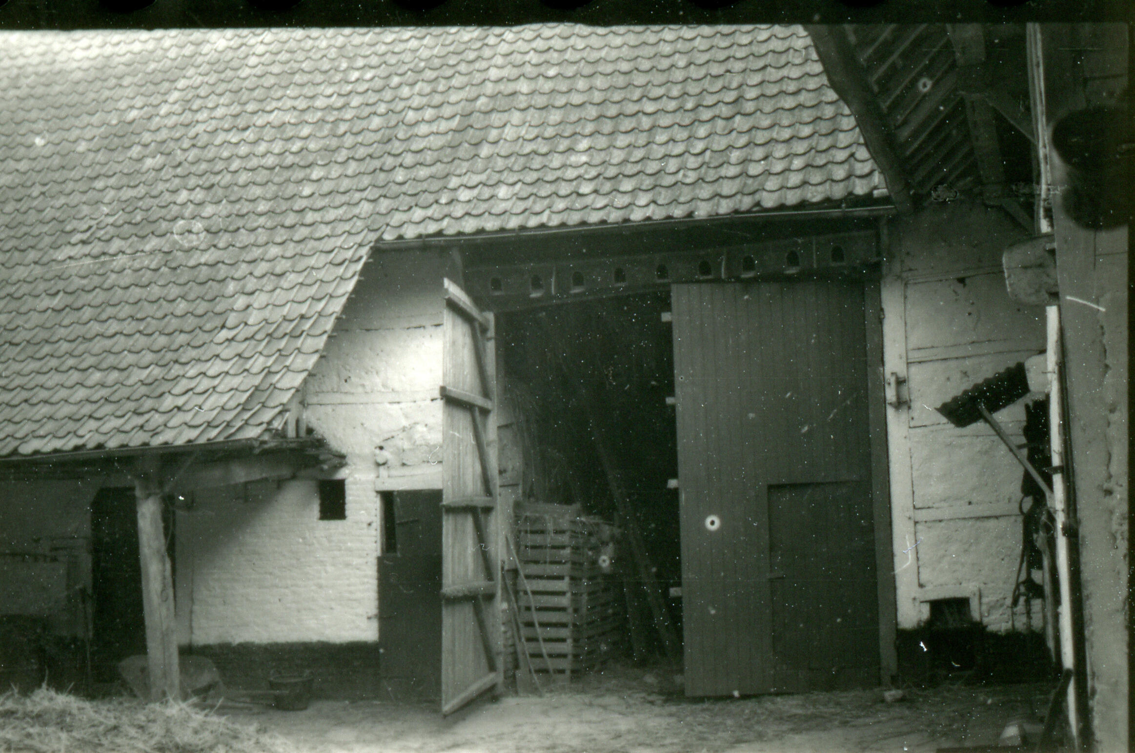 Binnenplaats van een vierkantshoeve in het Limburgse Schimmert, met een dubbele inrijdeur naar het bedrijfsgedeelte van de boerderij, met daarboven een rij vogelhuisjes.