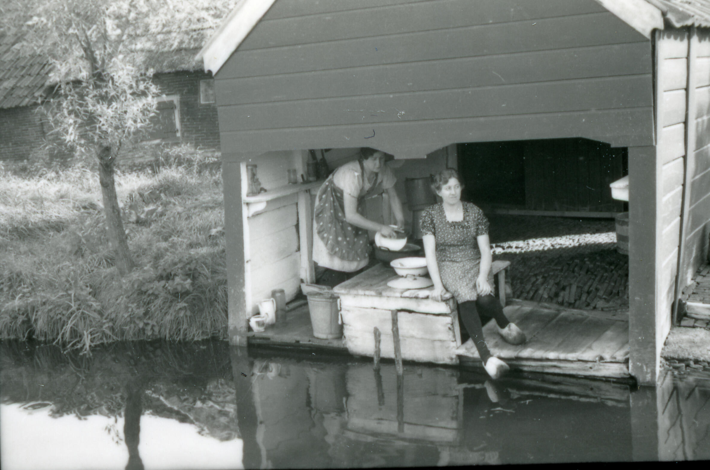 Twee vrouwen in een boenhok, Zegveld, 1941 (zwart-wit foto)