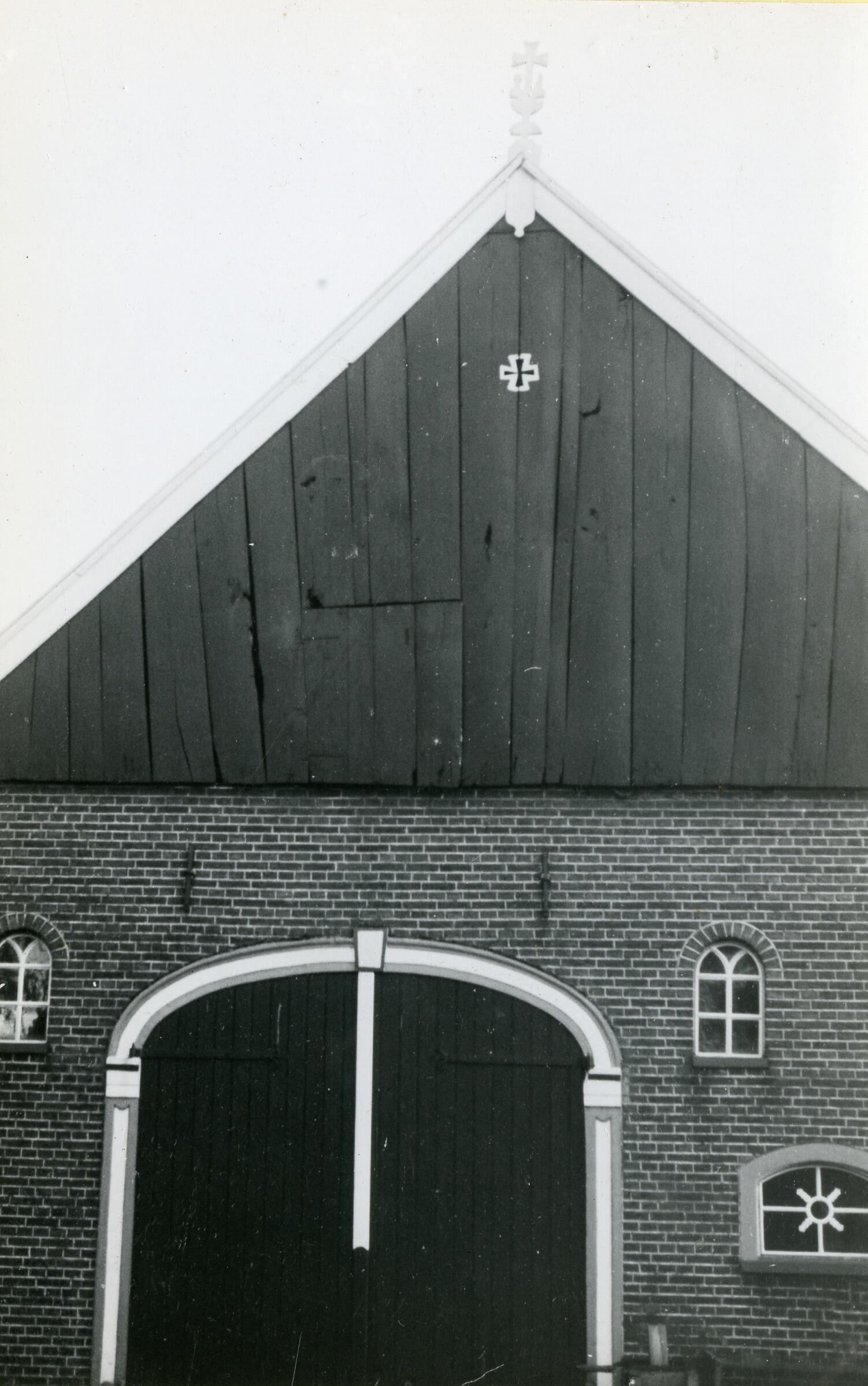 Achtergevel van een boerderij met een houten topgevel met daarop een Maltezer kruis en in de nok een gevelteken in het Overijsselse Tubbergen.