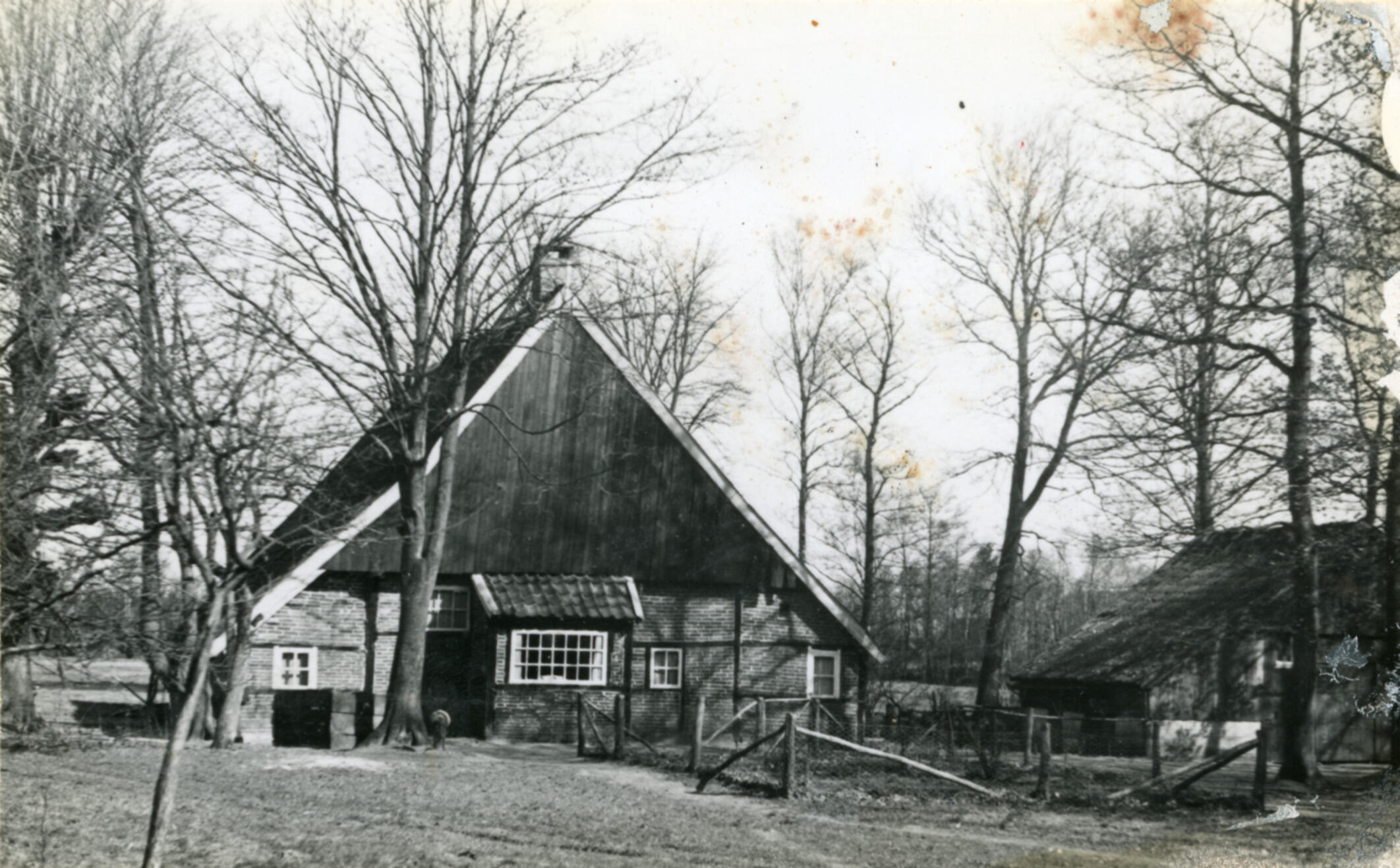 Voorgevel van een hallenhuisboerderij van het type los hoes met een haarderker aan de Kooikerweg 4 in het Overijsselse Mekkelhorst. De boerderij stond bekend als Reinders/Reinink en werd in 1940 gesloopt. De muren van de boerderij bestaan uit vakwerkbouw gevuld met bakstenen. De voorgevel heeft een houten topgevel.