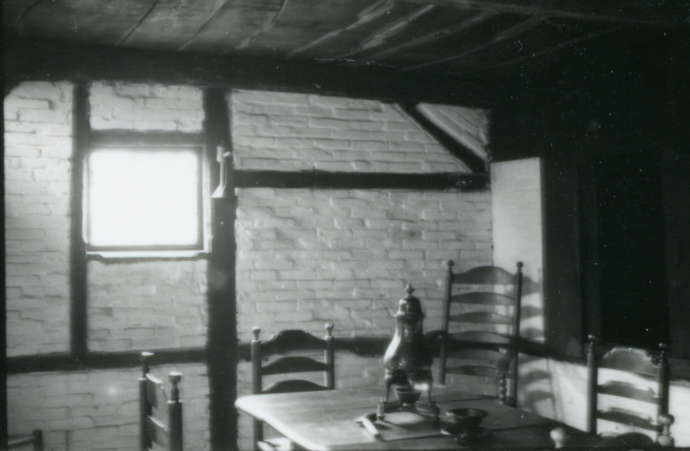 Interieur van de endskamer van de hallenhuisboerderij op het terrein van Museum Twenthe in Enschede. De muur bestaat uit vakwerkbouw van hout gevuld met bakstenen. Op de tafel staat een kraantjeskan.