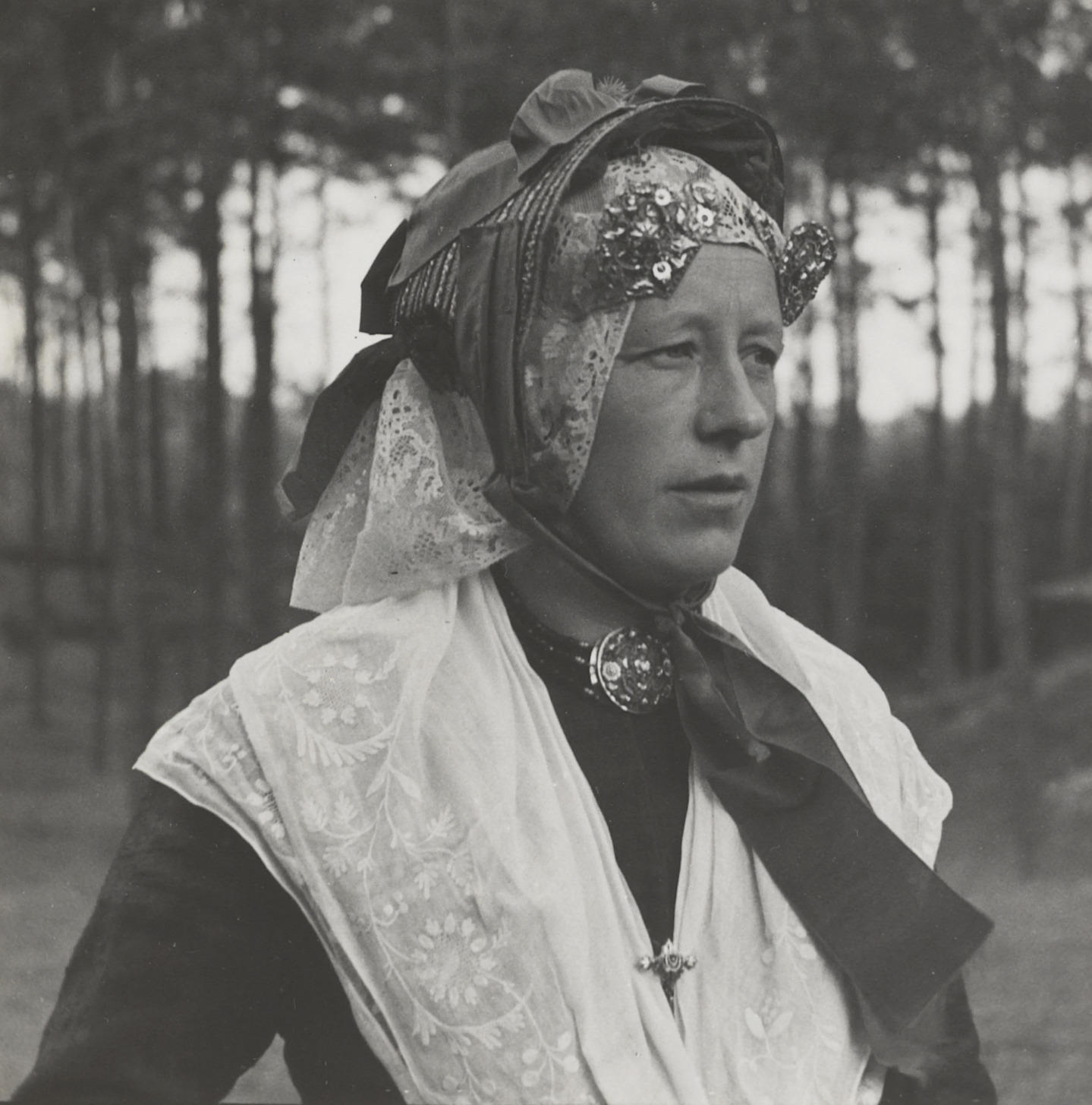 Vrouw verkleed in Drentse dracht, 1948 (zwart-wit foto)