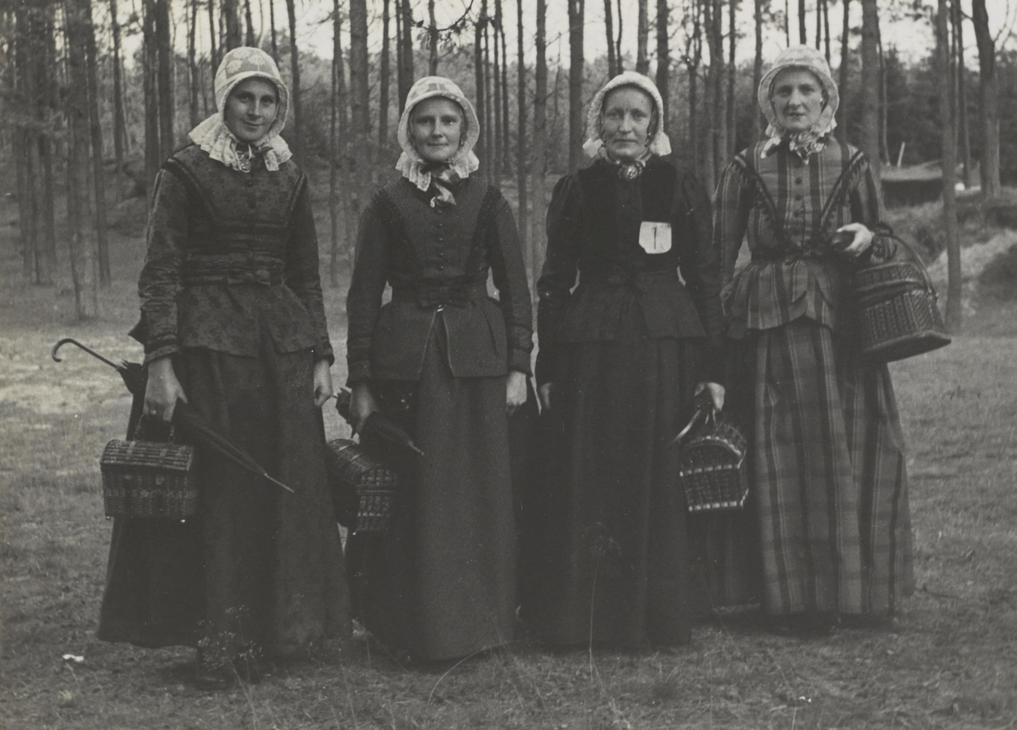Vier vrouwen uit Pesse, verkleed in Drentse streekdracht tijdens een congres in Rolde. Een van de vrouwen is mevrouw M. Steenbergen.