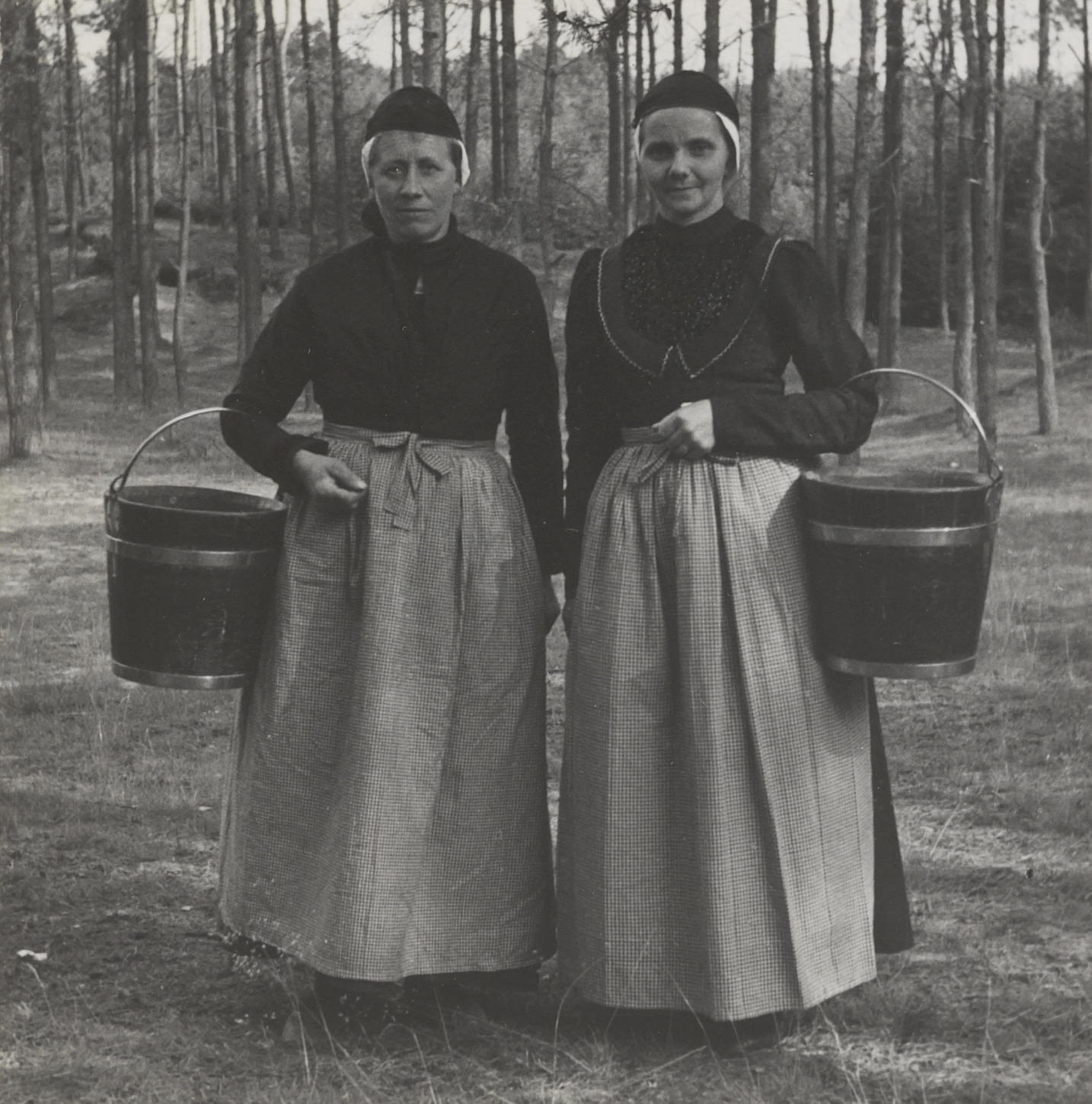 Vrouwen verkleed in Drentse dracht, 1948 (zwart-wit foto)