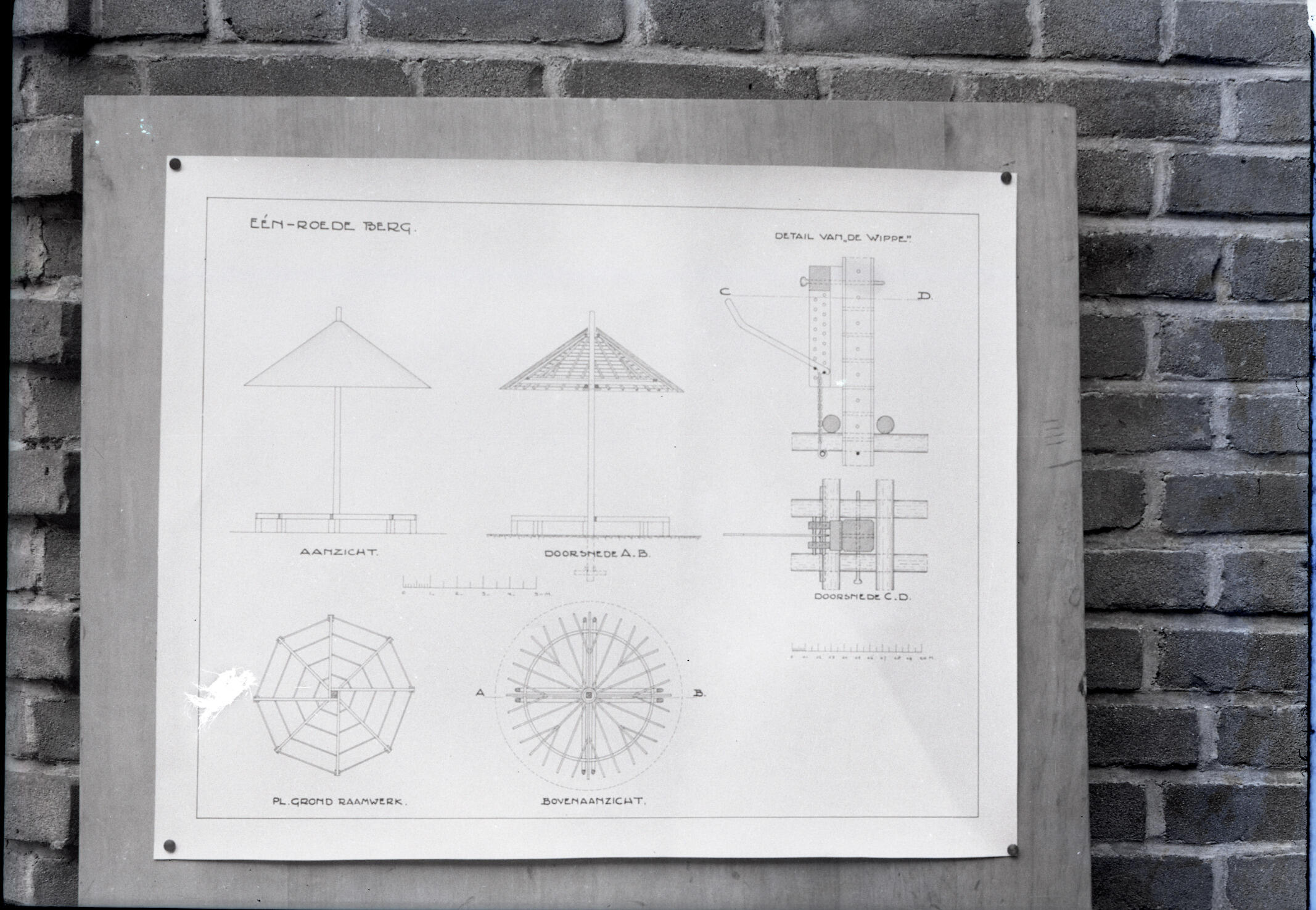 Tekening met aanzichten, doorsneden, plattegronden en een detail van 'de wippe' van een hooiberg met een roede.