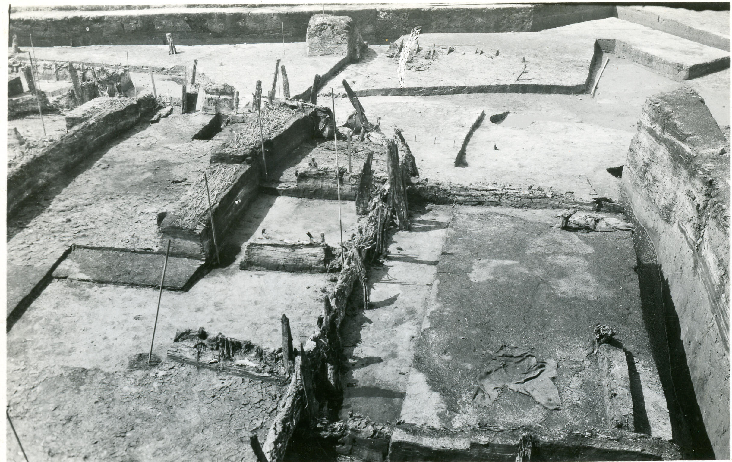 De resten van gebouwen die gevonden zijn tijdens de afgraving van de terp waarop het dorp Ezinge ligt. In Groningen worden terpen wierden genoemd. Afgegraven wierdegrond werd verkocht om te gebruiken als bodemverbeteraar op arme zandgronden. Archeoloog Albert Egges van Giffen (1884-1973) van de Rijksuniversiteit Groningen heeft van 1923 tot 1934 archeologisch onderzoek uitgevoerd bij ...