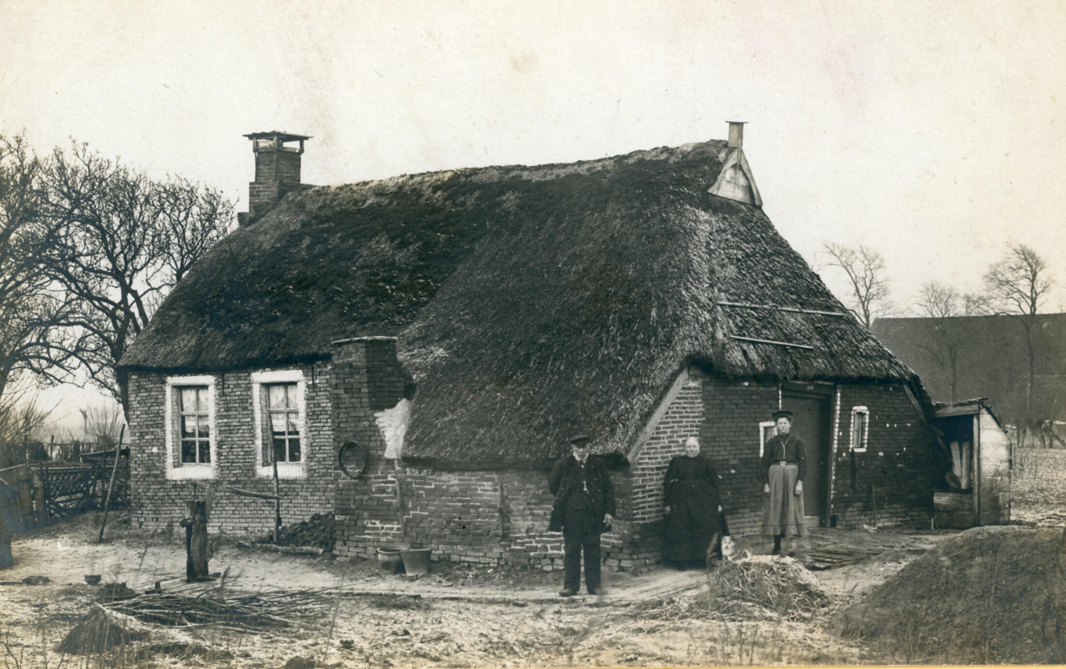 Zij- en achtergevel van een hallenhuisboerderij in het westen van Drenthe. Voor de boerderij staan een waterpomp en drie mensen met een hond. Rechts is een privaat.