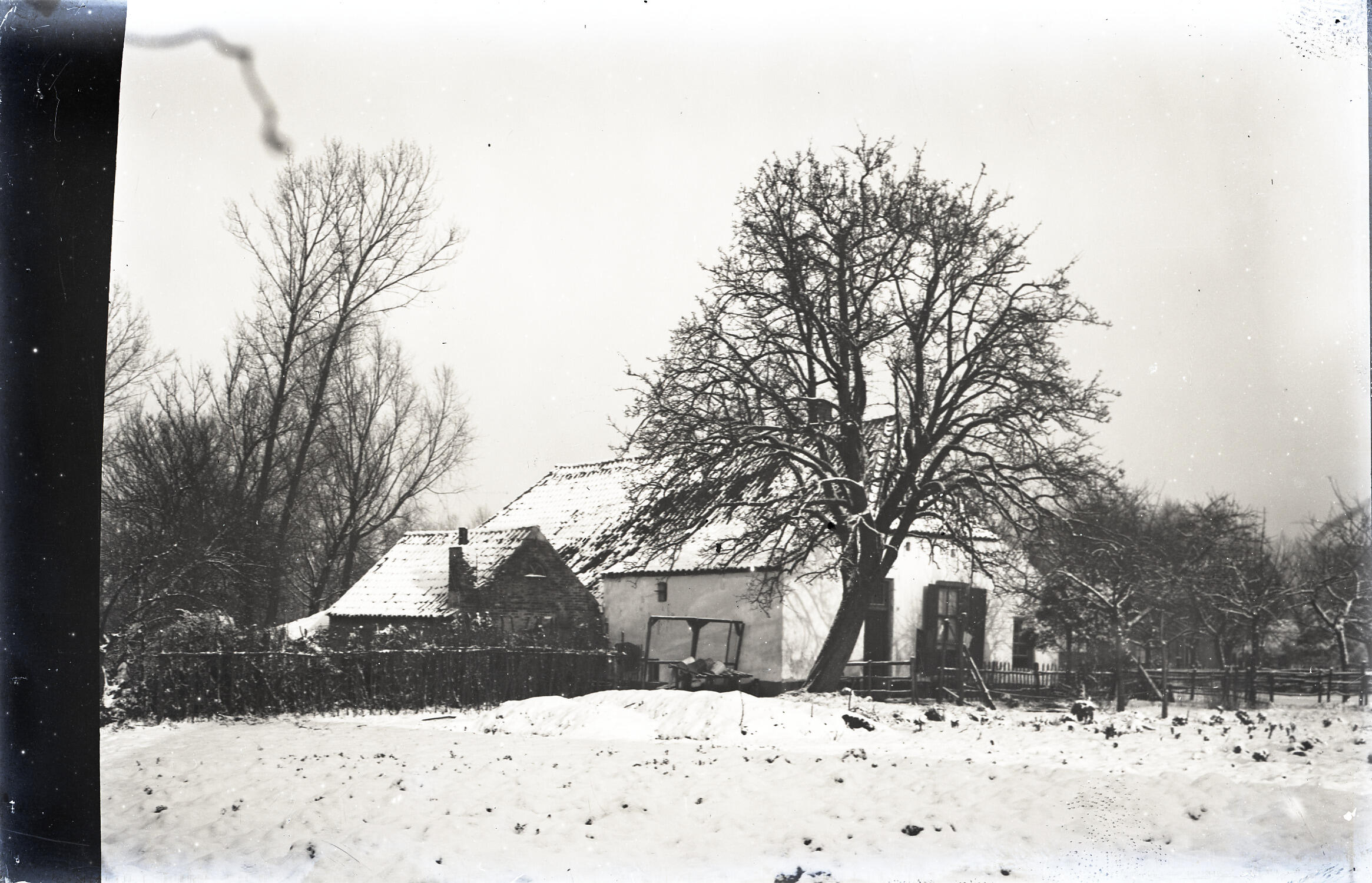 Zij- en voorgevel van een boerderij in de sneeuw met links een bijgebouw in het Gelderse Wageningen.