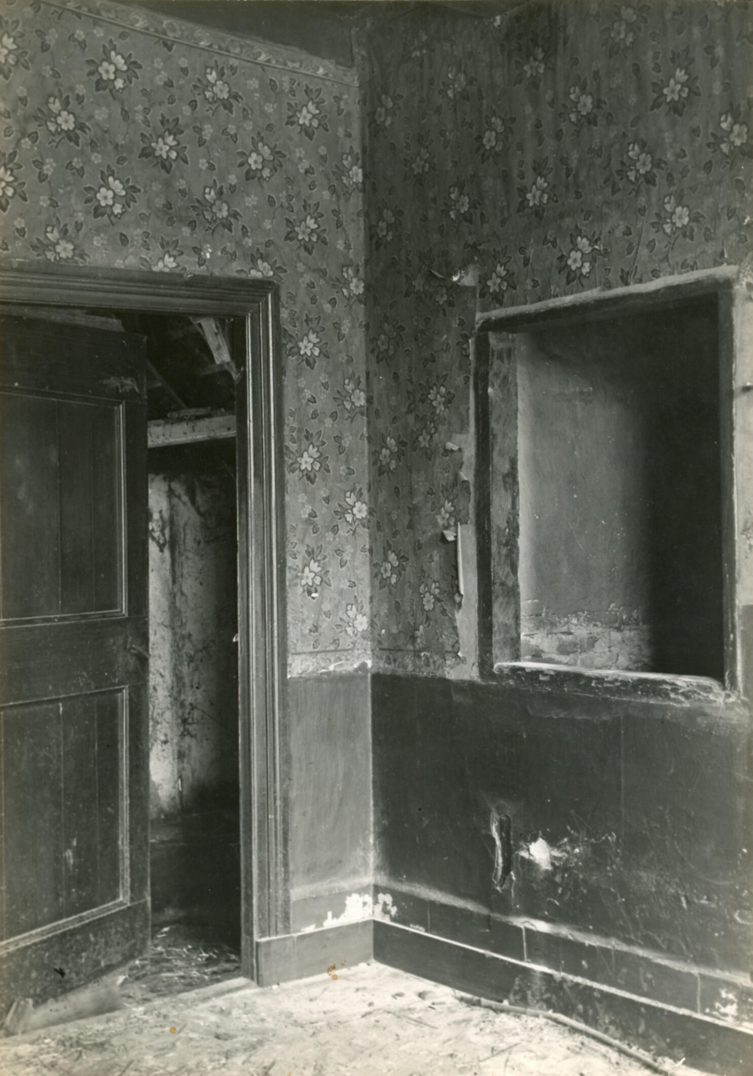 Interieur van een boerderij in het Gelderse Nijkerk, met links een deur en rechts een bedstede.