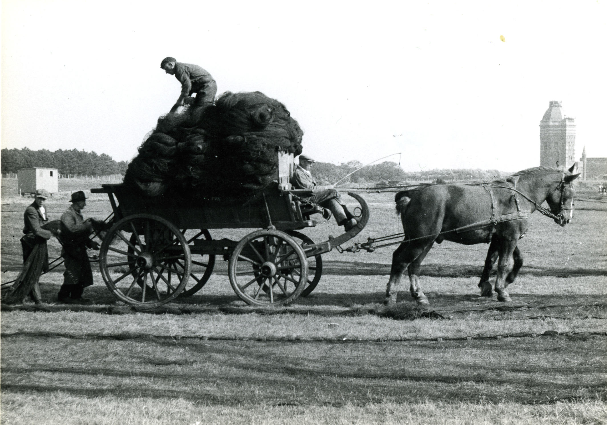 Door de nettenboetsters gerepareerde visnetten worden in Scheveningen op een wagen geladen, de zogenoemde nettenwagen.