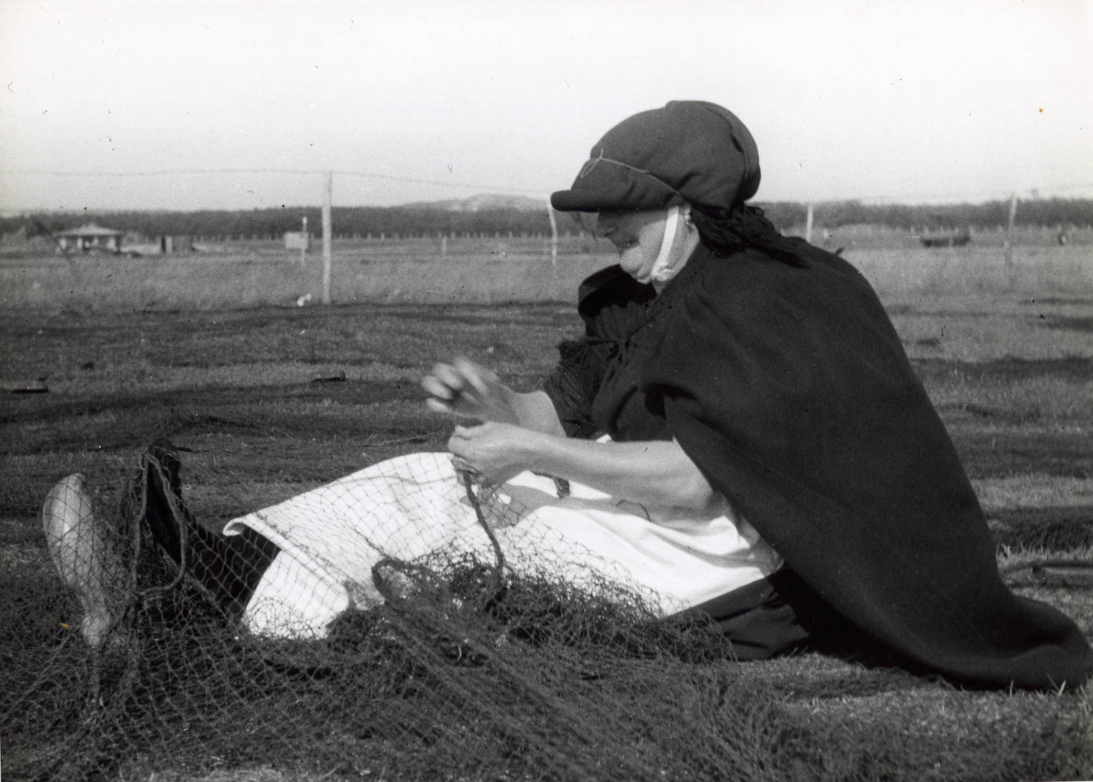 Nettenboetster in Scheveningse streekdracht aan het boeten op het wantveld, waar visnetten gedroogd en gerepareerd werden, in Scheveningen. Ze draagt een witte schort. Op de witte schort zijn de kapotte mazen van het visnet beter te zien. Met haar grote teen houdt ze het net strak. Ze draagt op haar hoofd een zwarte wollen omslagdoek ...