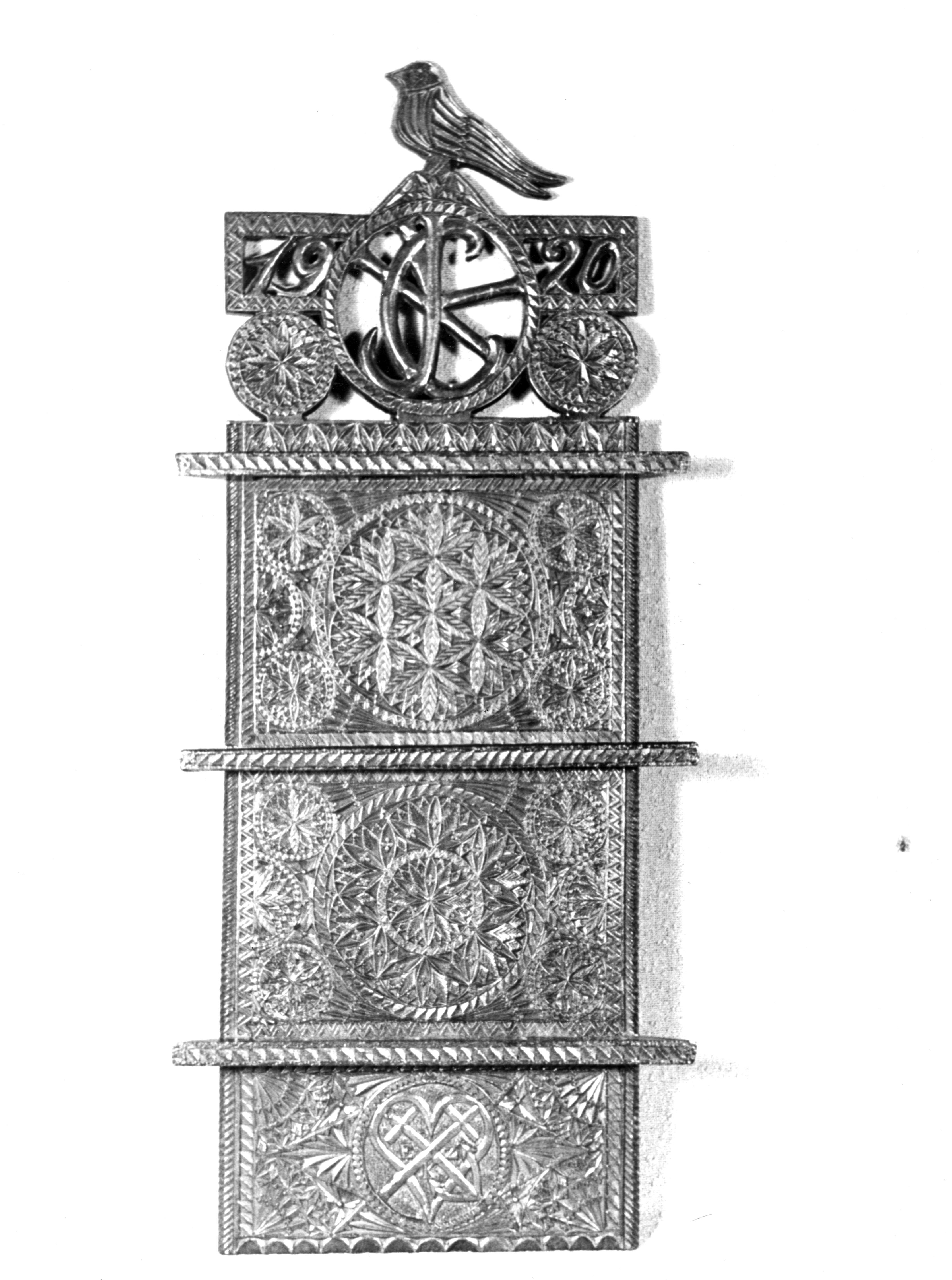 Lepelrek, versierd met houtsnijwerk en de datering 1920, gefotografeerd op Marken.