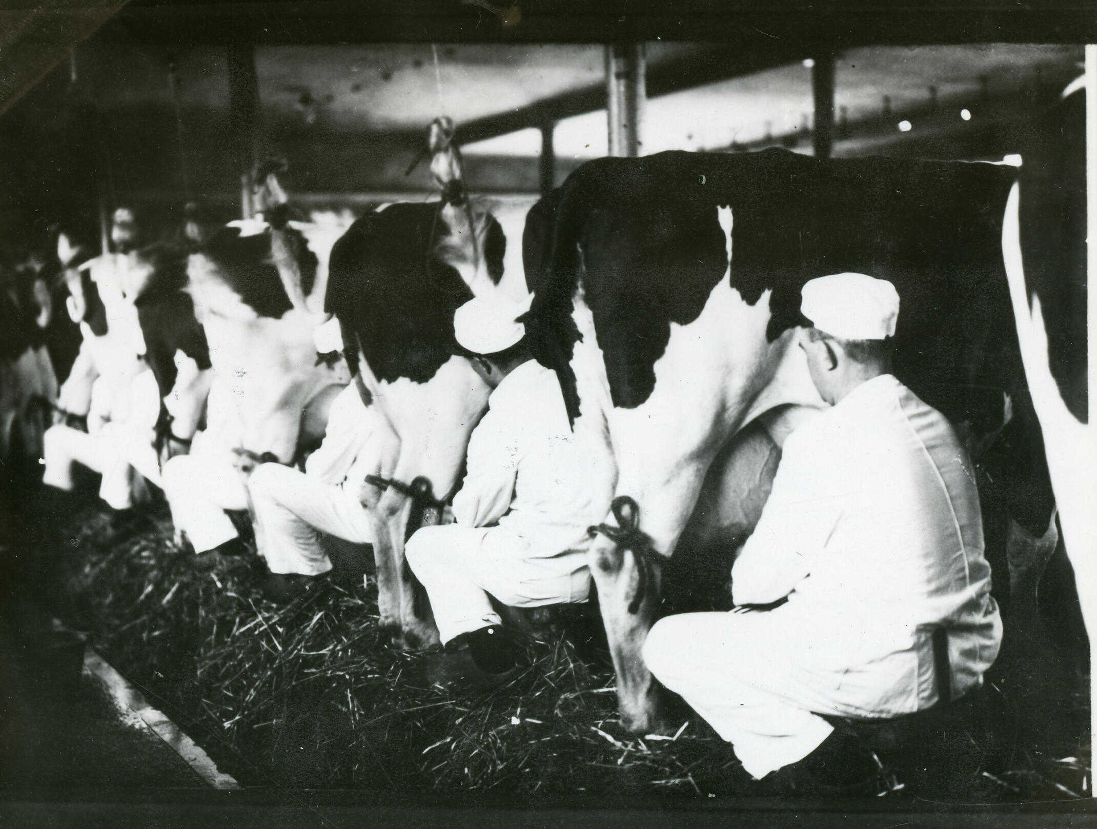 Het melken van koeien, Wilsveen, 1926-1936 (zwart-wit foto)