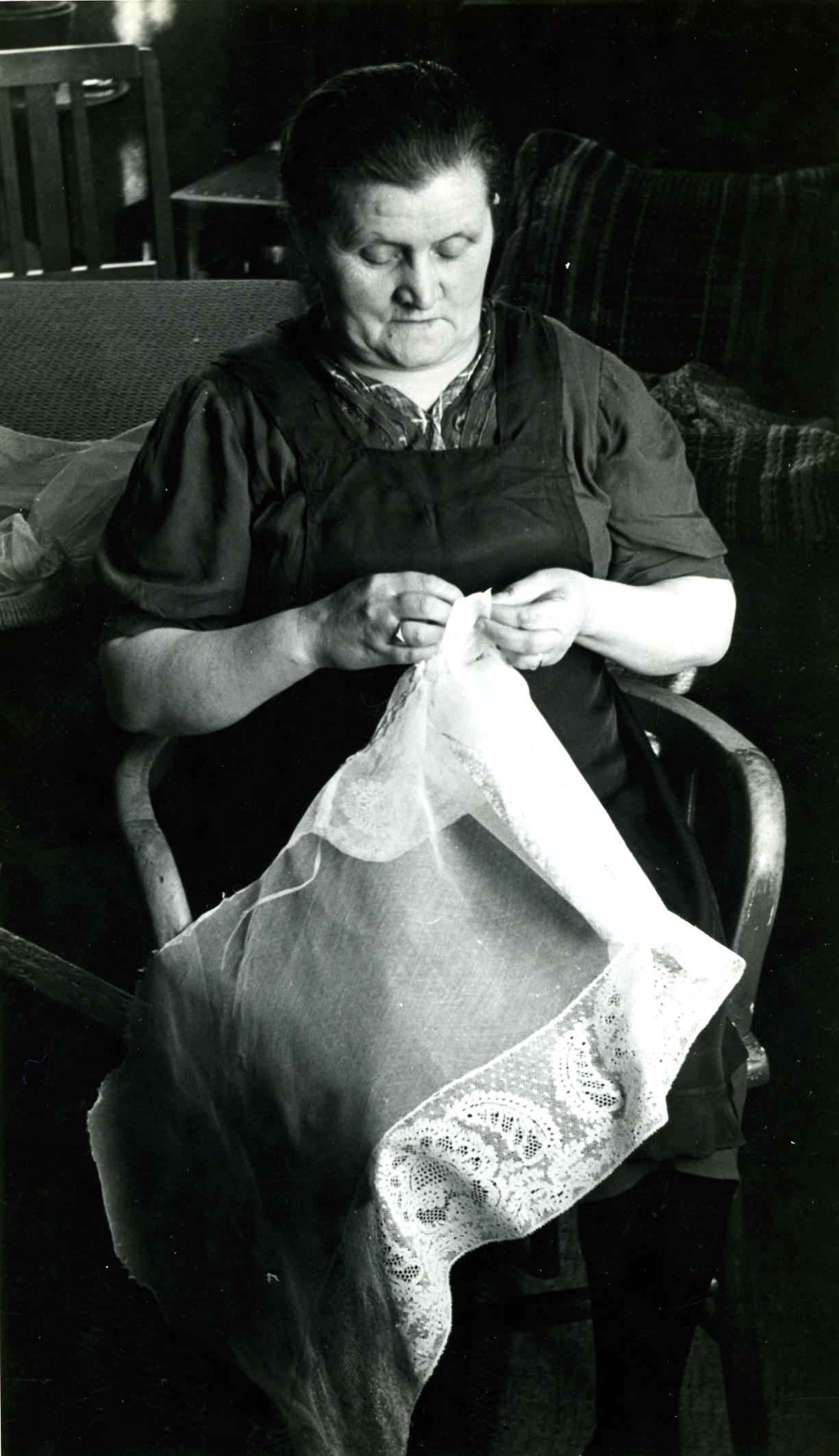 Mutsenmaakster G. Moore-Everaerts uit Horst, bezig met het naaien van een Noord-Limburgse vrouwenmuts.