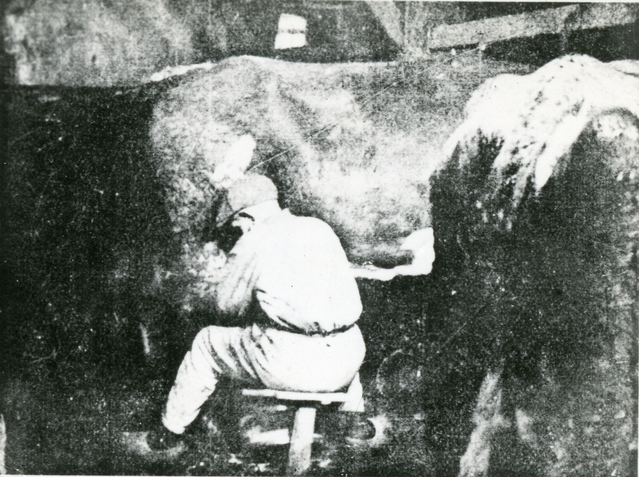 Melkende boer, Nederland, 1926-1936 (zwart-wit foto)