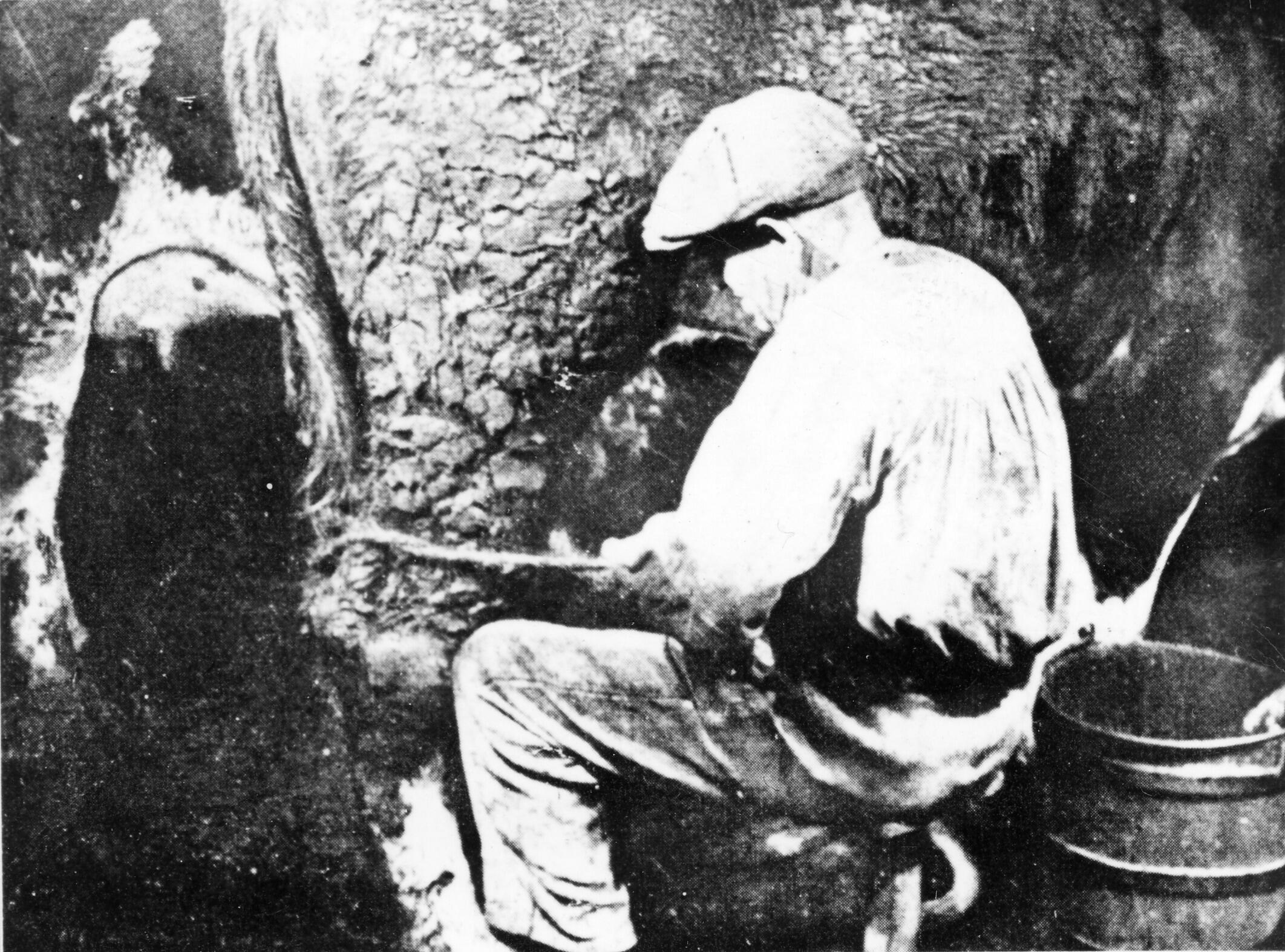 Een boer melkt een koe in een stal in Nederland. Fotograaf Hendrik Jan van Houten schreef over deze foto dat het touw waarmee de achterpoten van de koe bij elkaar worden gebonden op de stalbodem heeft gelegen, waardoor koemest de handen van de melker bevuilt.