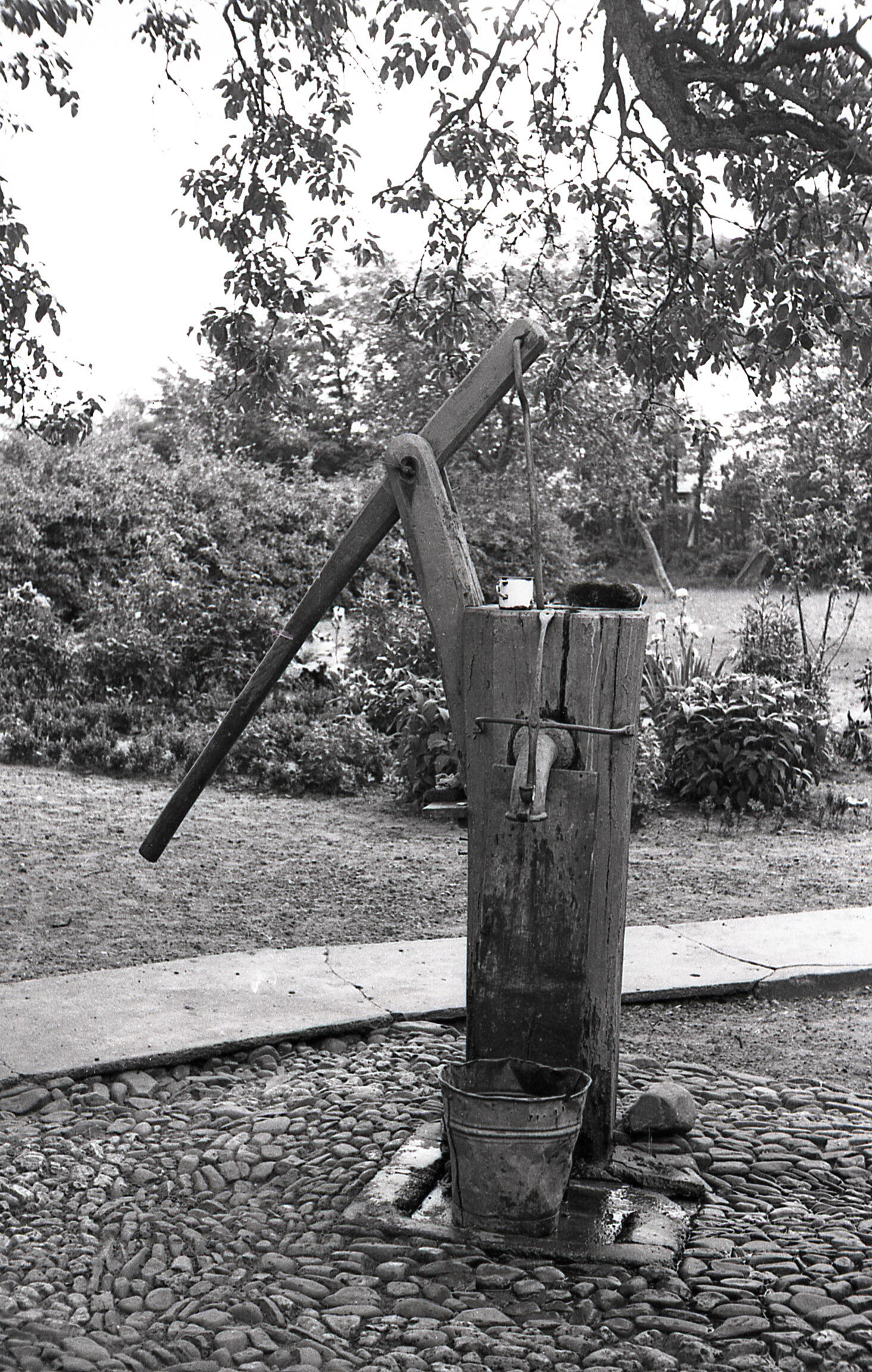 Houten waterpomp op een keitjesvloer bij een boerderij in het Utrechtse Leerdam.
