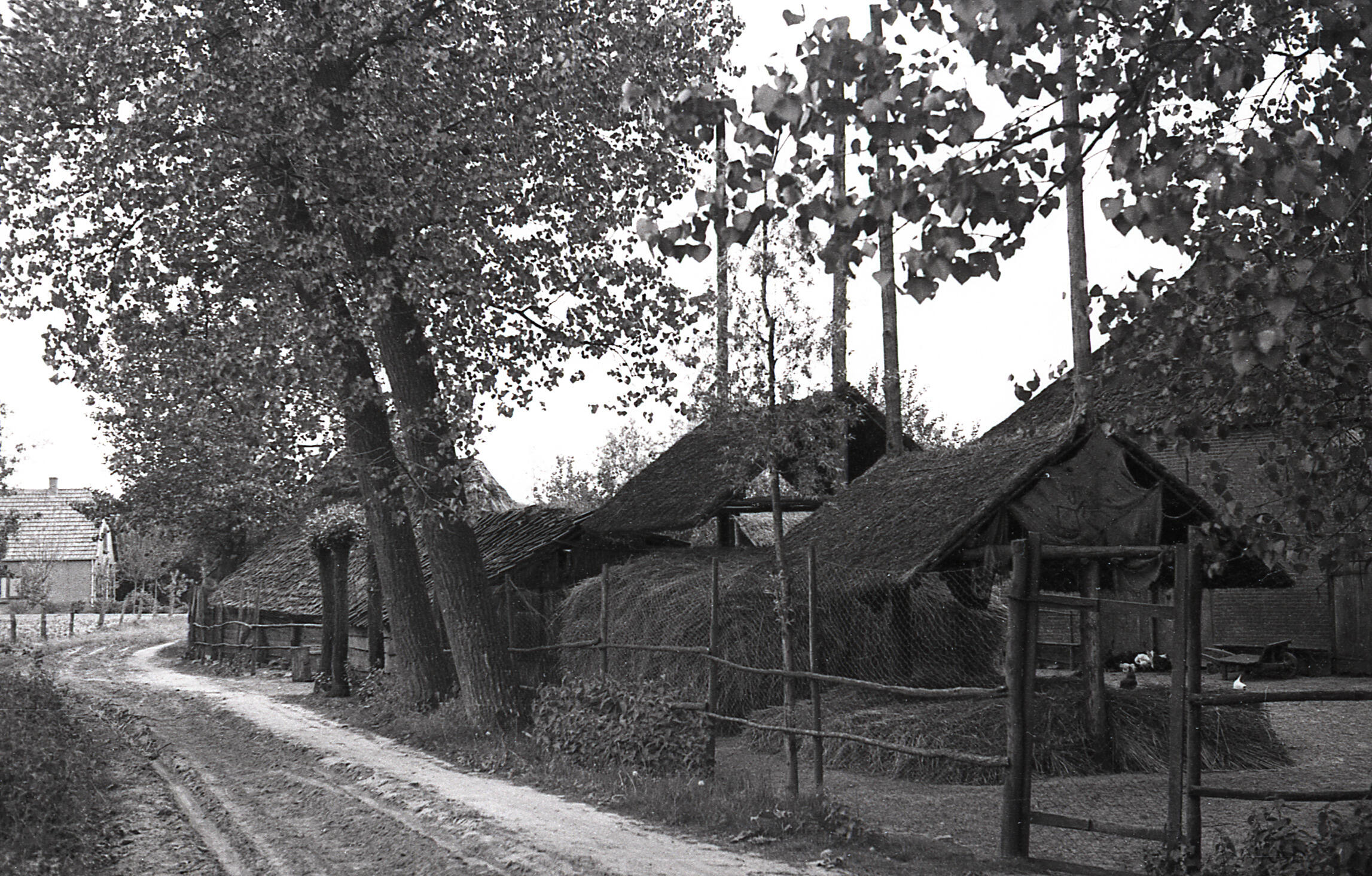 Hooibergen met in hoogte verstelbare daken op roeden bij een boerderij in het Utrechtse Leerdam. Links ligt een zandweg.