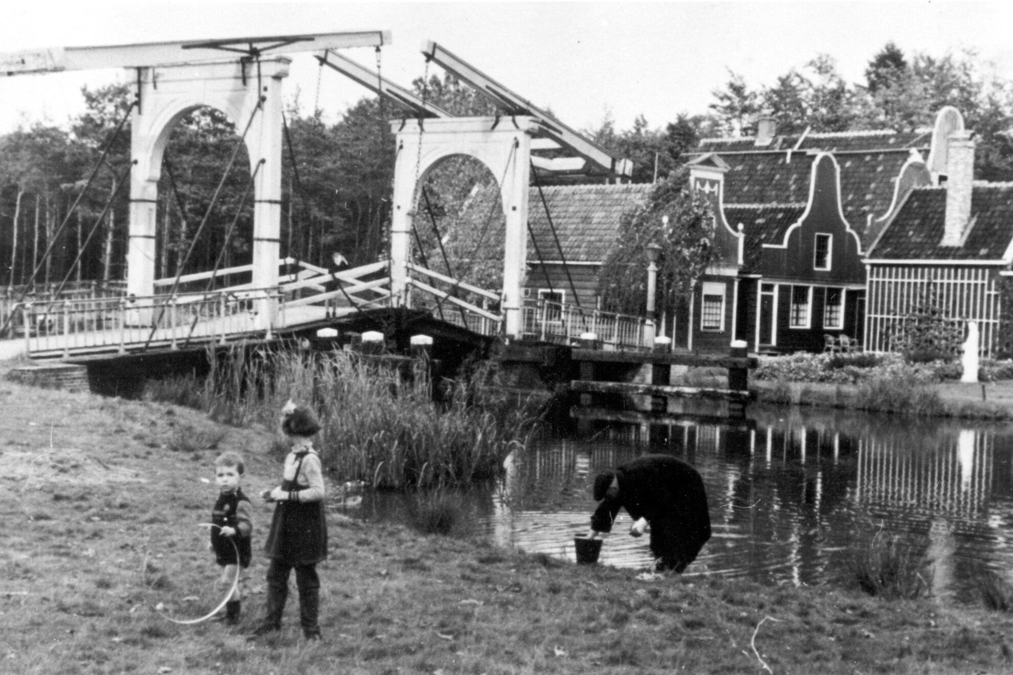 Arnhemse oorlogsevacués voor de dubbele ophaalbrug uit Ouderkerk aan de Amstel, met daarachter de Zaanse buurt in het Nederlands Openluchtmuseum. Twee kinderen spelen met een hoepel, terwijl een man aan het wassen is in de vijver.