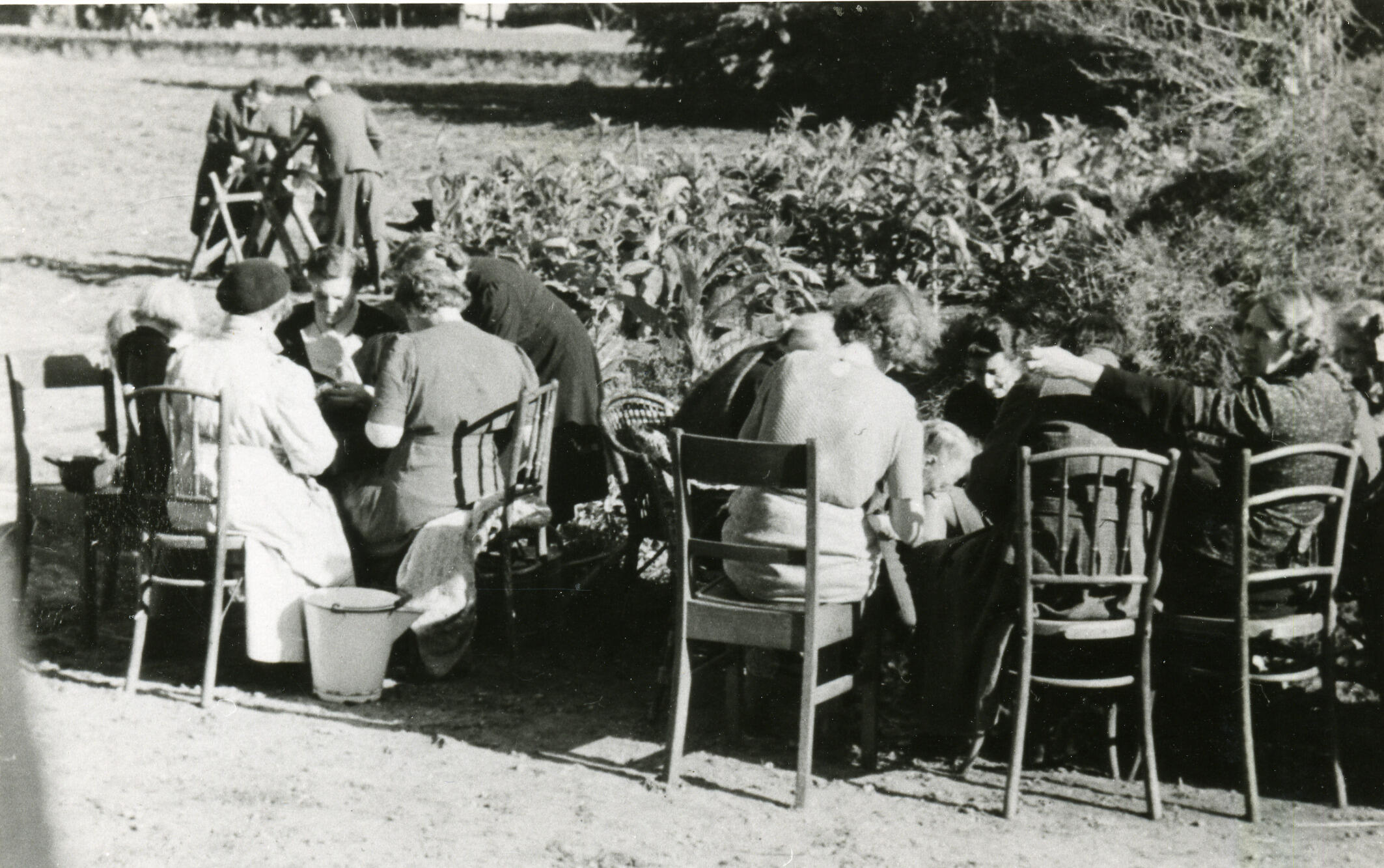 Een groep Arnhemse oorlogsevacués schilt aardappelen op het terrein van het Nederlands Openluchtmuseum.
