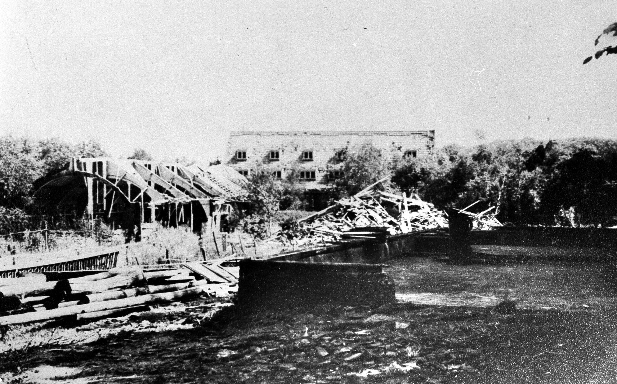 Twee verwoeste loodsen met daarachter het beschadigde tentoonstellingsgebouw op het terrein van het Nederlands Openluchtmuseum. In de loodsen huisden tot 29 december 1944 Arnhemse oorlogsevacués. Op 11 februari 1945 werden deze loodsen verwoest door een neerstortende V1. Op deze plaats staat vandaag de dag het entreegebouw van het museum.